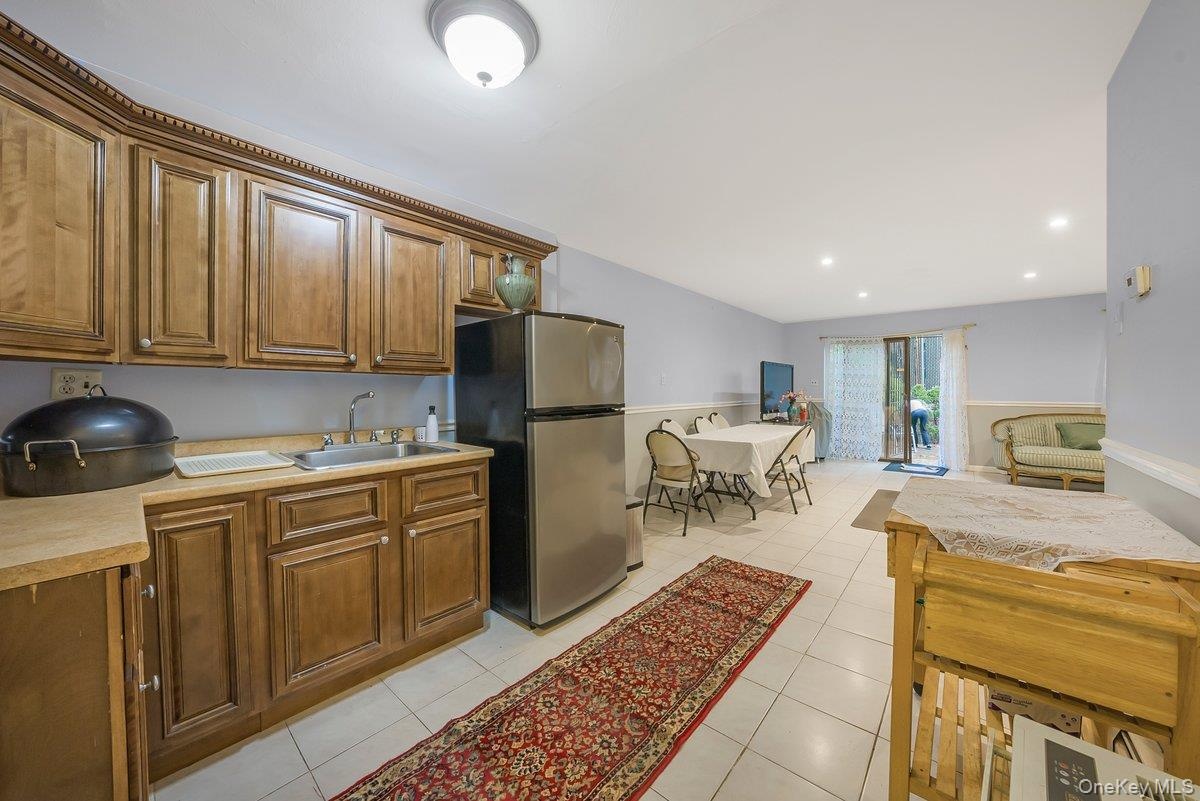- Kitchen featuring brown cabinets, light countertops, freestanding refrigerator, light tile patterned floors, and recessed lighting