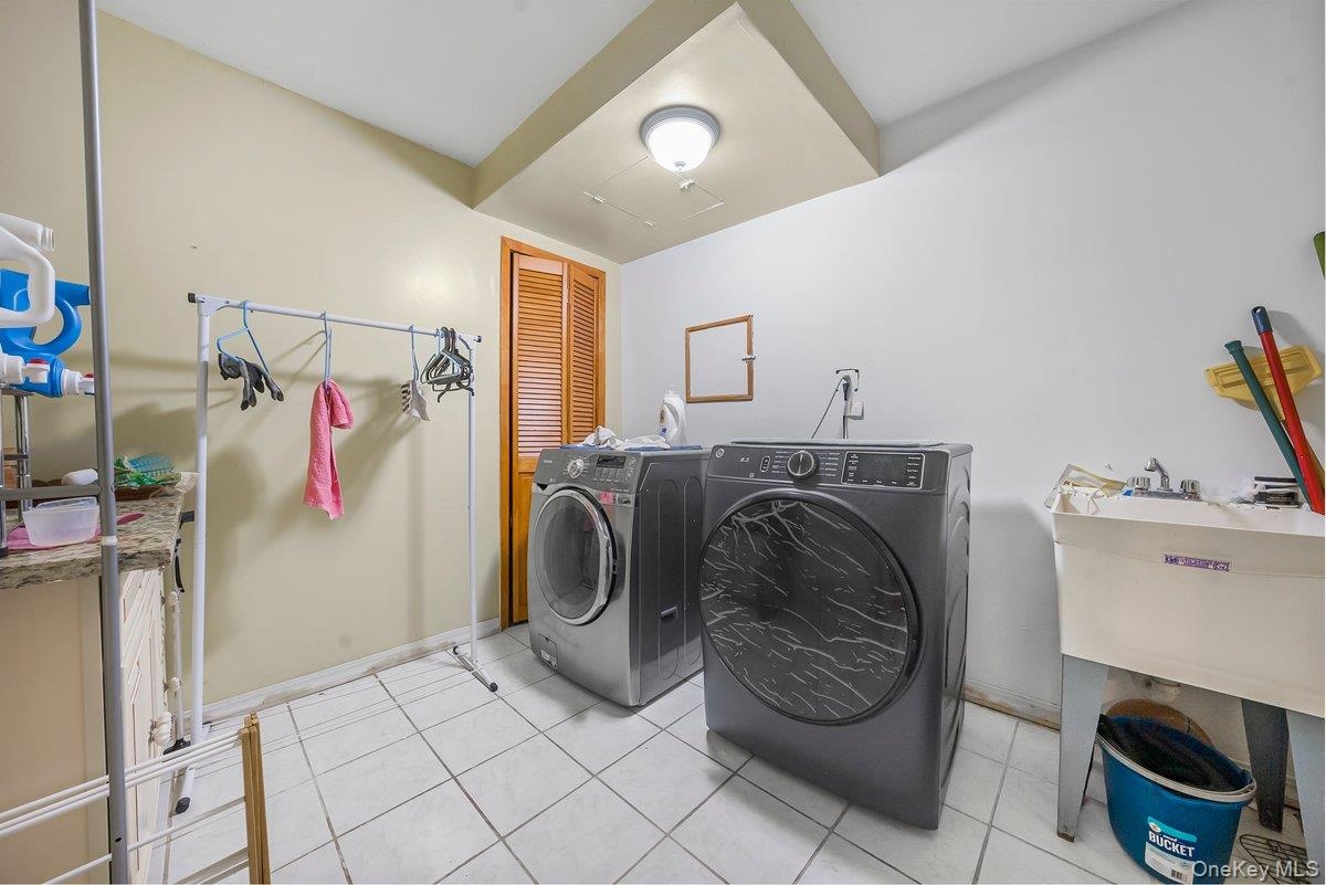 - Laundry room featuring light tile patterned floors and washer and clothes dryer