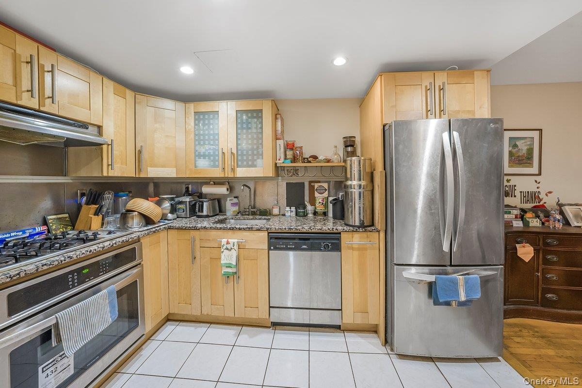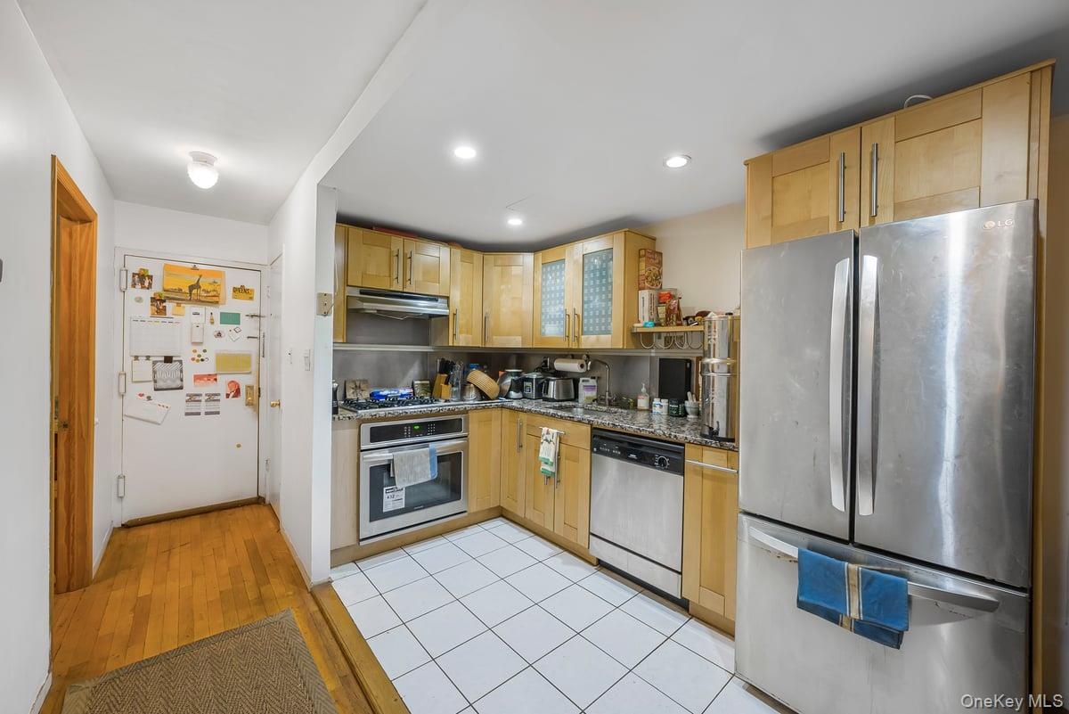- Kitchen featuring appliances with stainless steel finishes, light brown cabinetry, dark stone countertops, light tile patterned floors, and recessed l