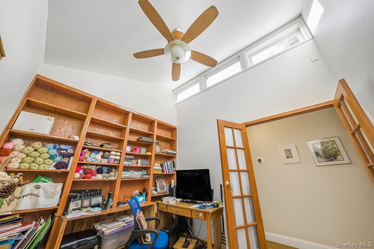 - Office area featuring a ceiling fan, french doors, built in study area, and a towering ceiling