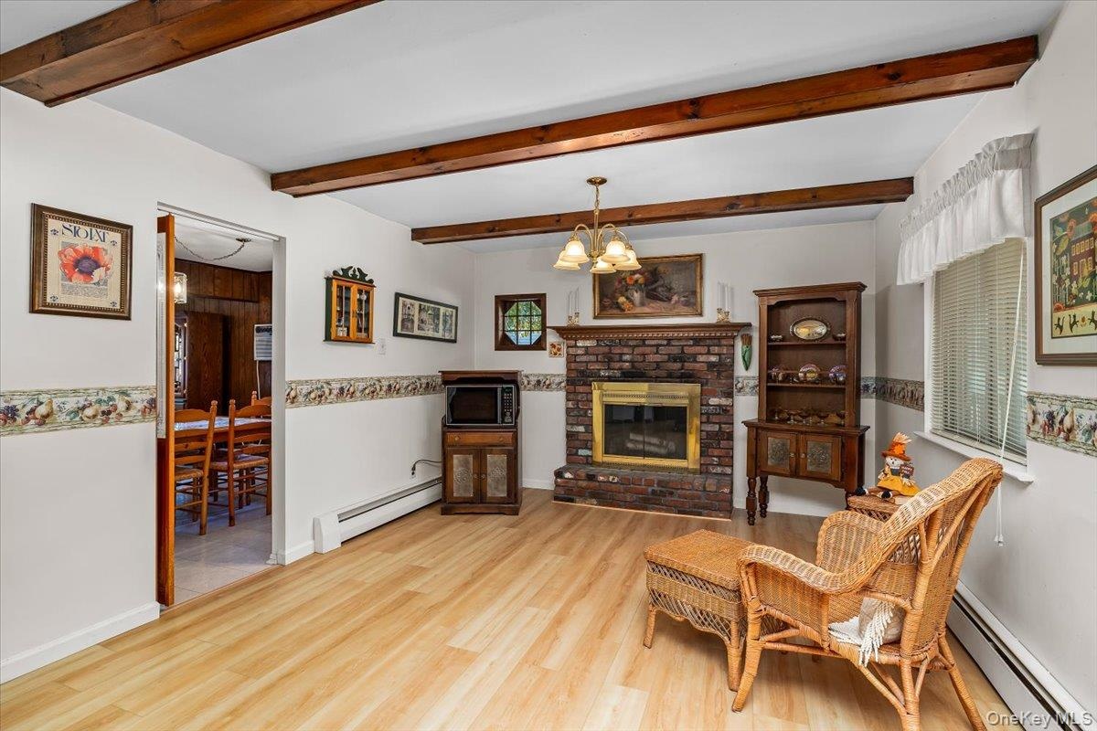 - Spacious living room, beamed ceiling, and an AC wall unit
