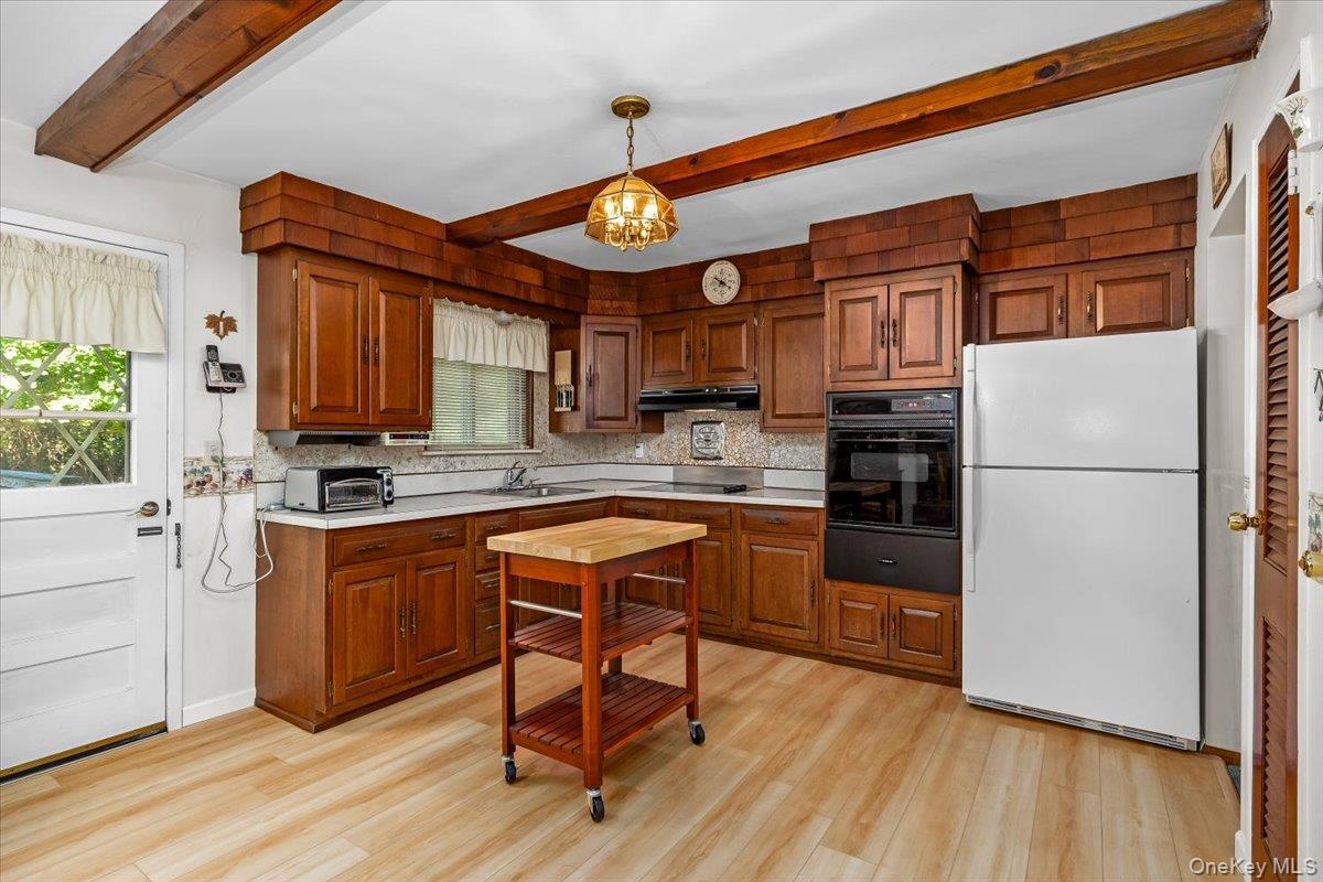 - Kitchen with wood cabinets, pantry, and door to deck and backyard