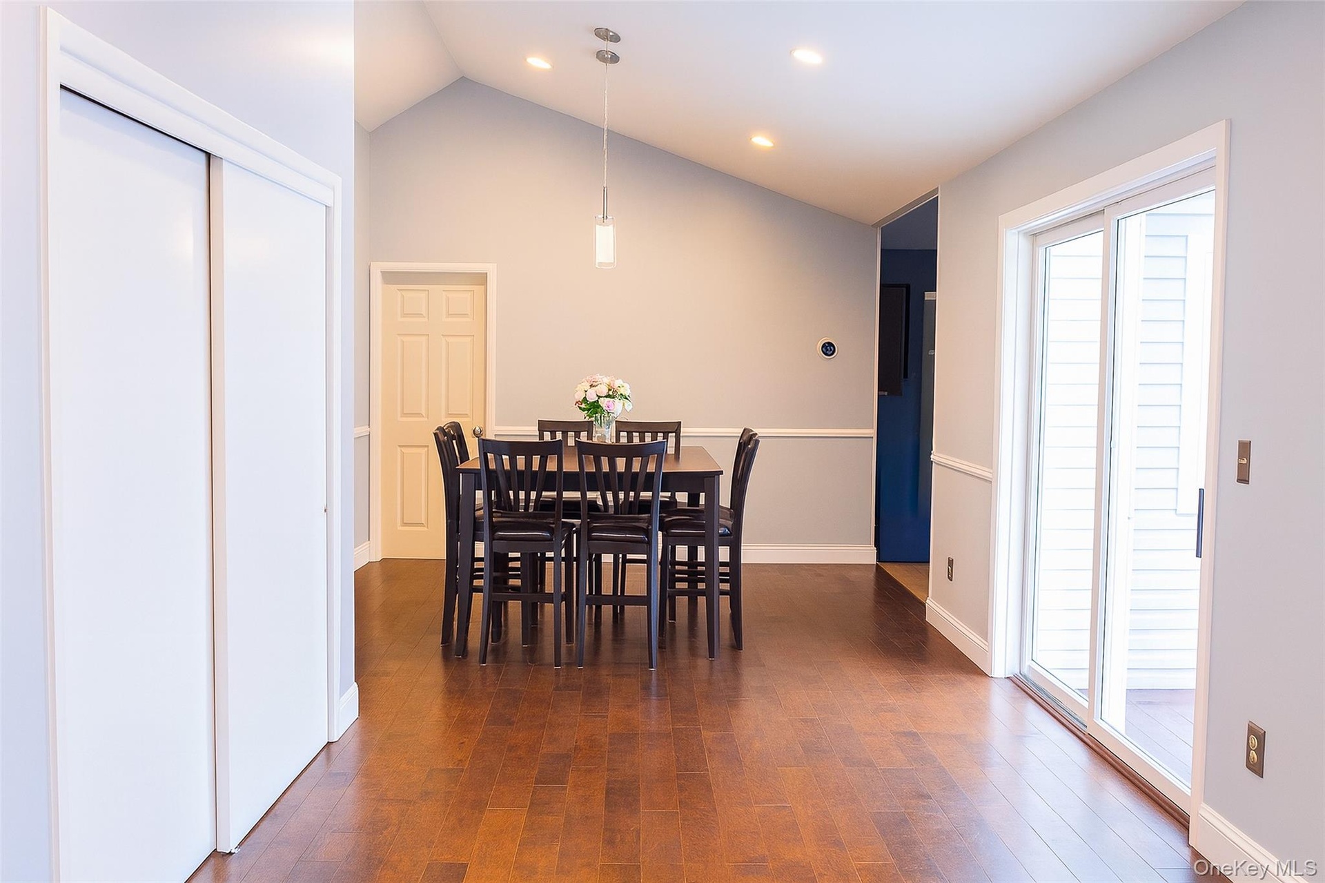 - Dining space featuring lofted ceiling, dark wood-style flooring, and recessed lighting