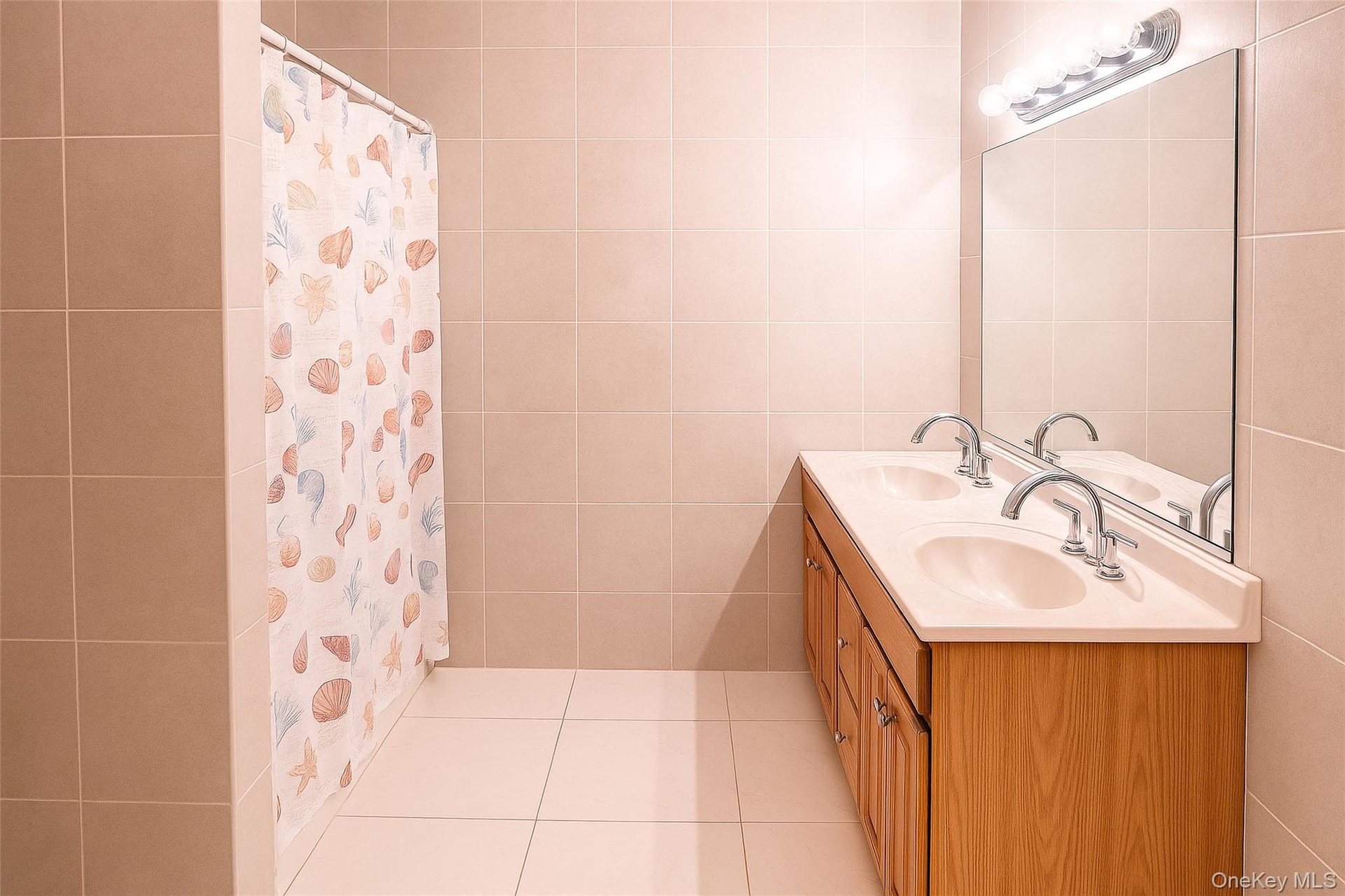 - Bathroom featuring tile walls, light tile patterned floors, double vanity, and curtained shower