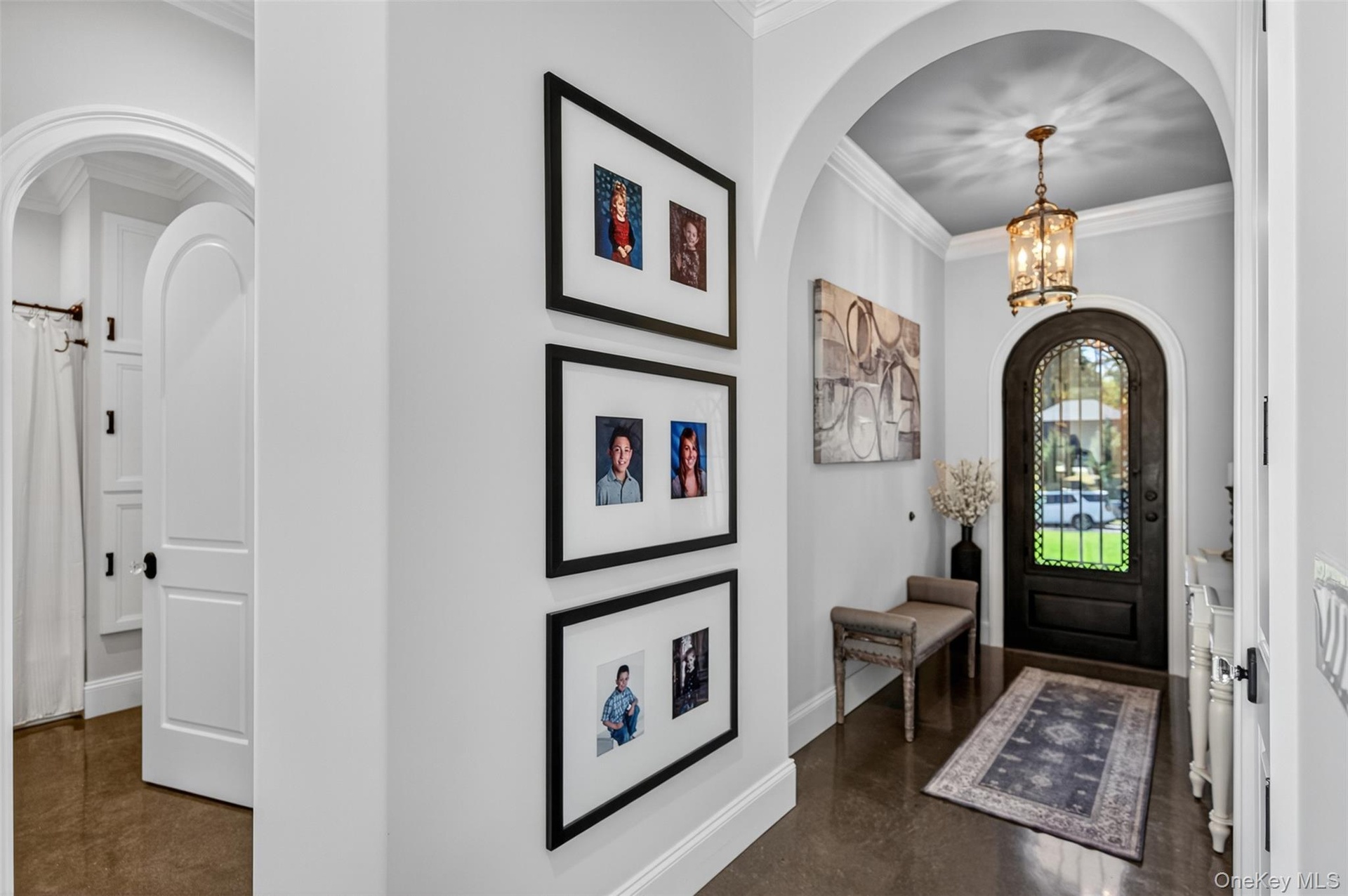- Entryway featuring arched walkways, a chandelier, crown molding, and finished concrete floors