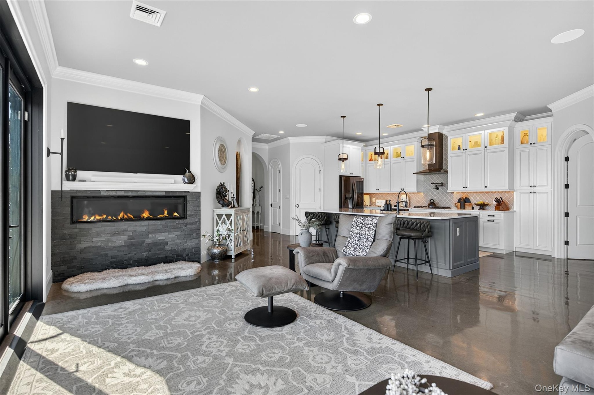 - Living area featuring finished concrete floors, ornamental molding, recessed lighting, a glass covered fireplace, and arched walkways