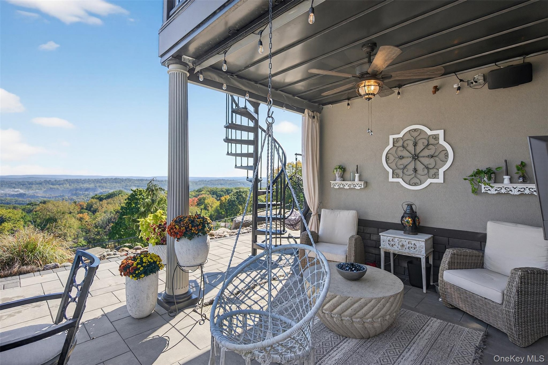 - View of patio with stairway, a ceiling fan, and an outdoor living space