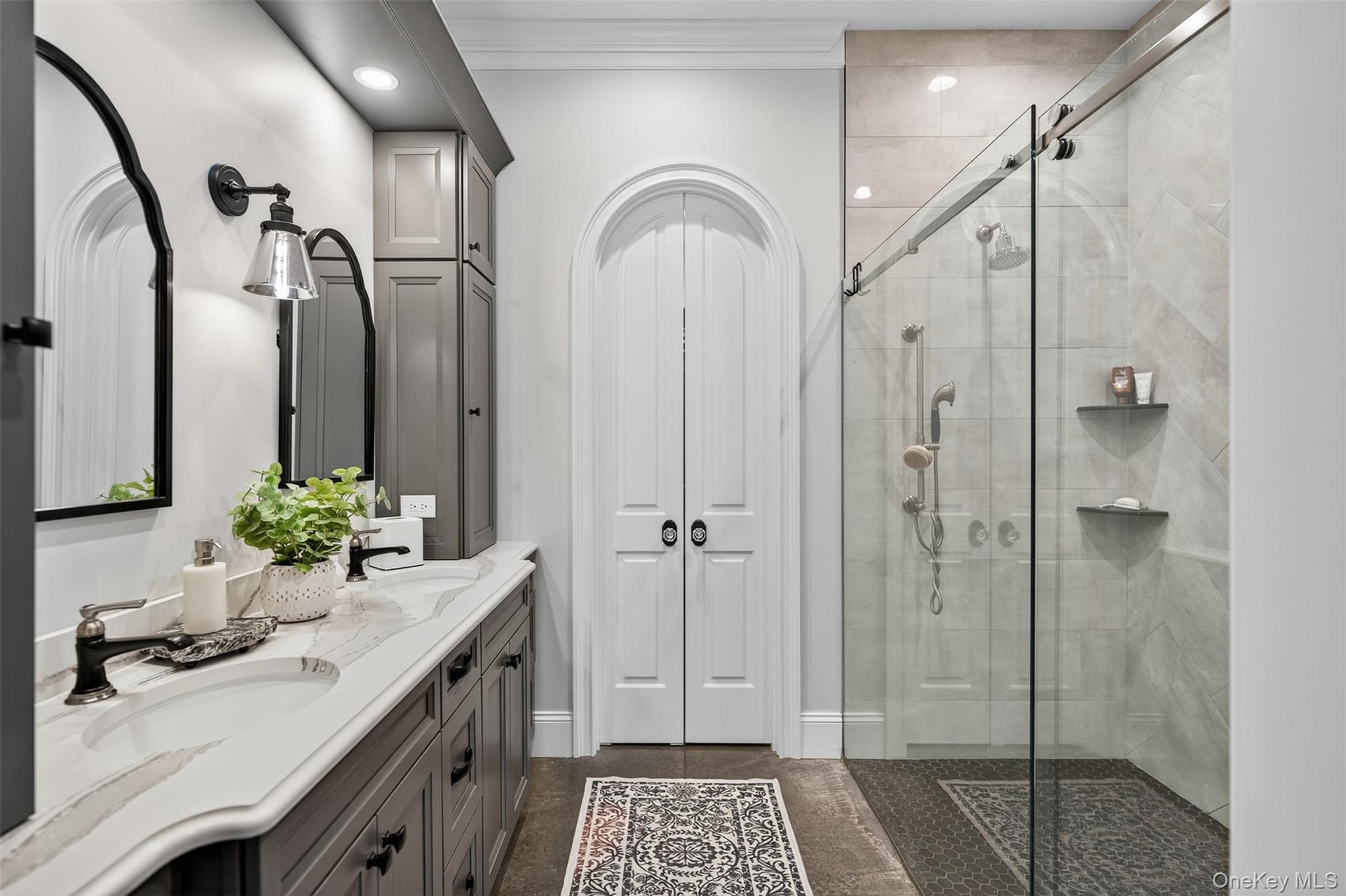 - Bathroom featuring a shower stall, double vanity, connected bathroom, crown molding, and a ceiling fan