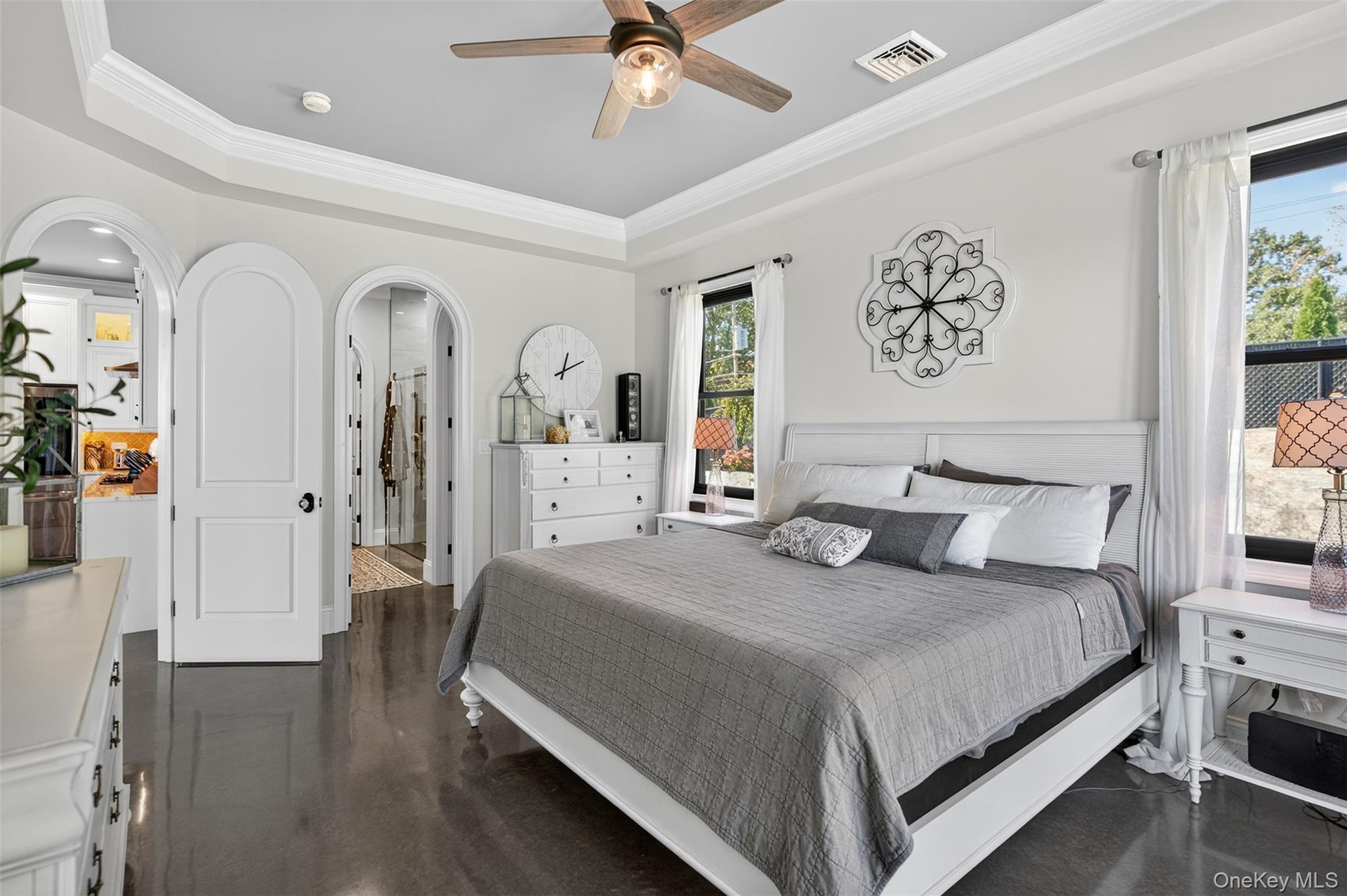 - Bedroom with multiple windows, ornamental molding, arched walkways, a tray ceiling, and a ceiling fan