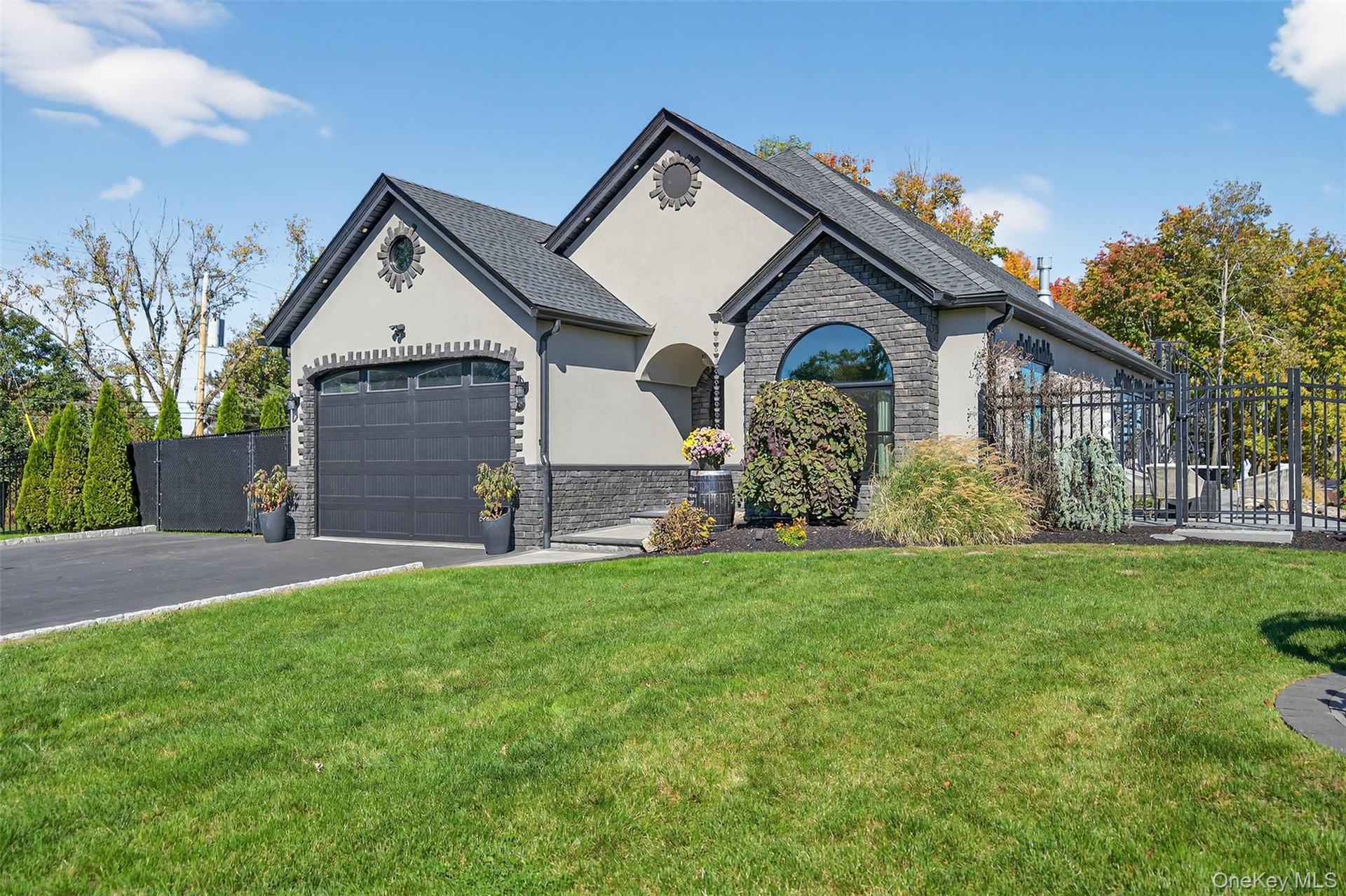 - View of front facade with stone siding, stucco siding, asphalt driveway, and view of wooded area