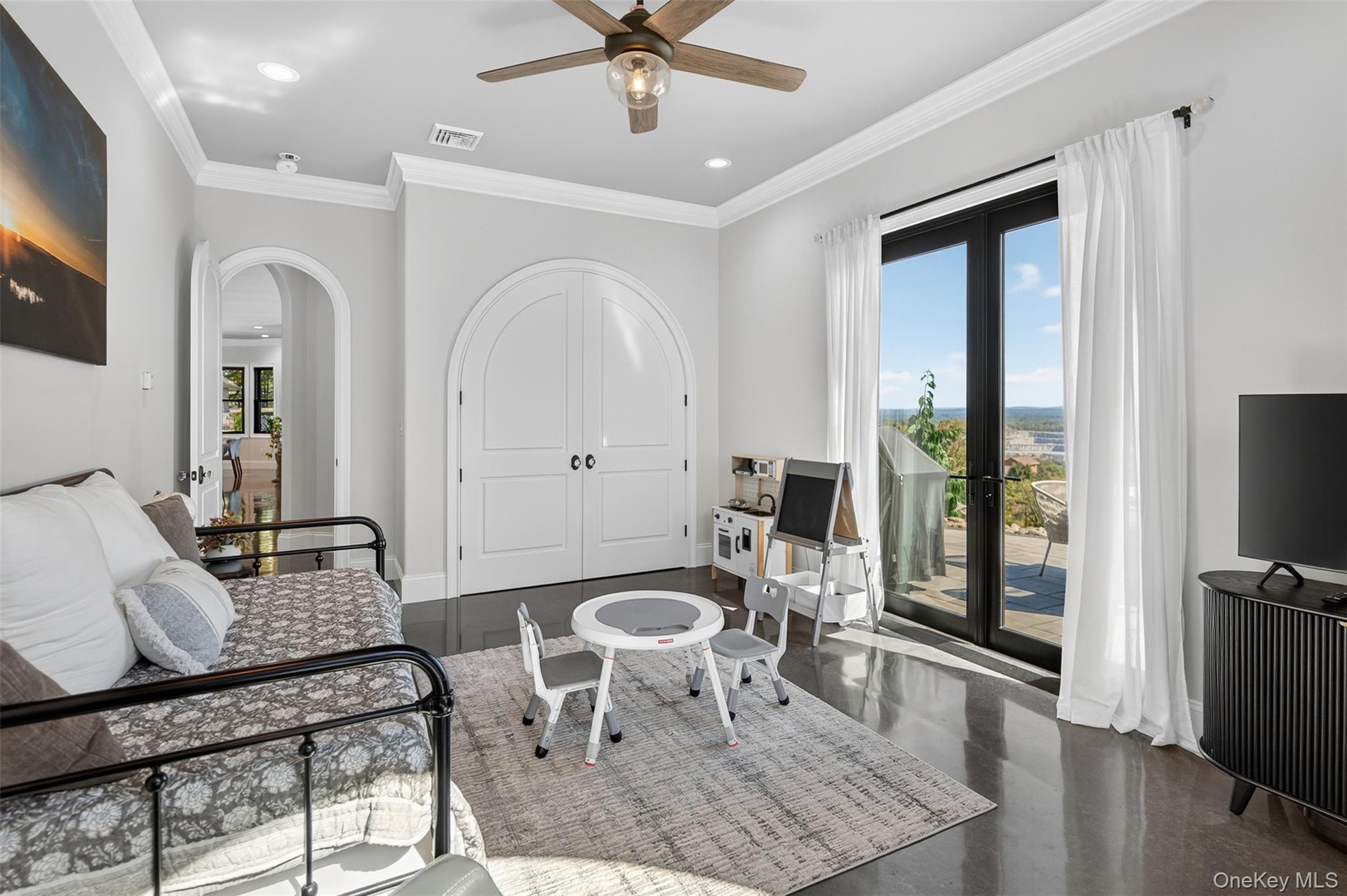 - Bedroom featuring a raised ceiling, access to outside, french doors, crown molding, and a ceiling fan