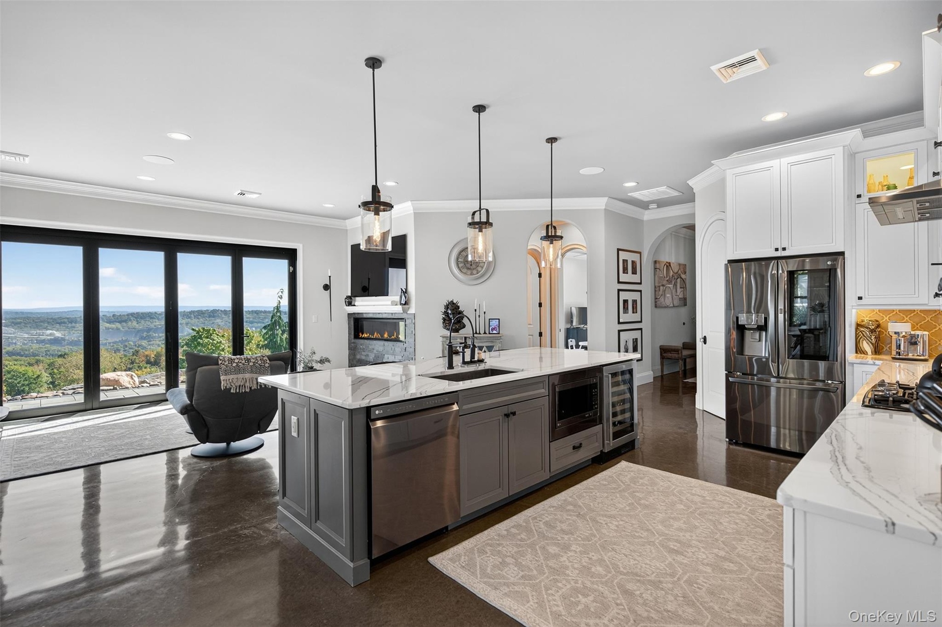 - Kitchen featuring wine cooler, ornamental molding, hanging light fixtures, a center island with sink, and stainless steel microwave