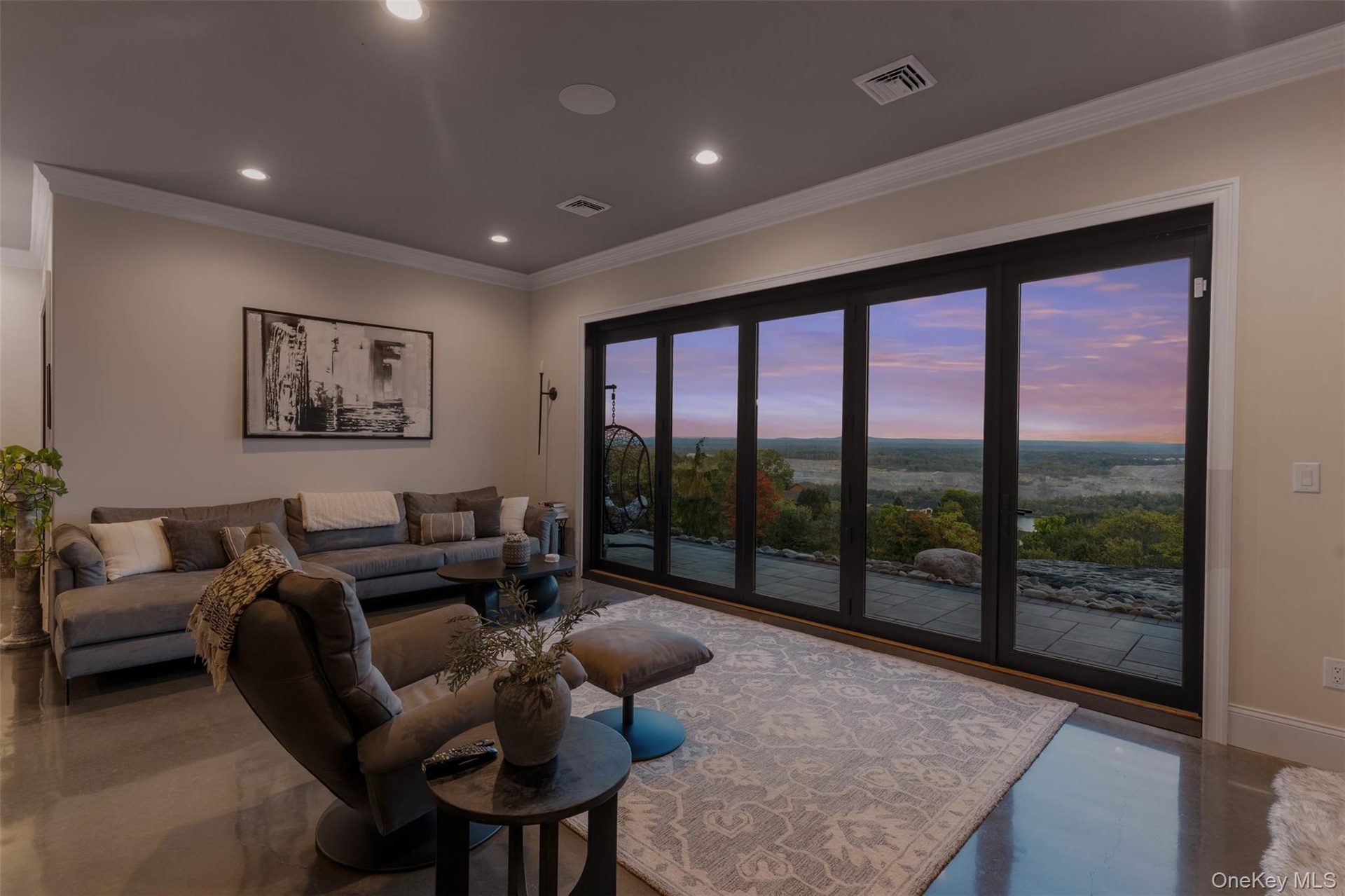 - Living room with finished concrete floors, recessed lighting, crown molding, and a glass covered fireplace