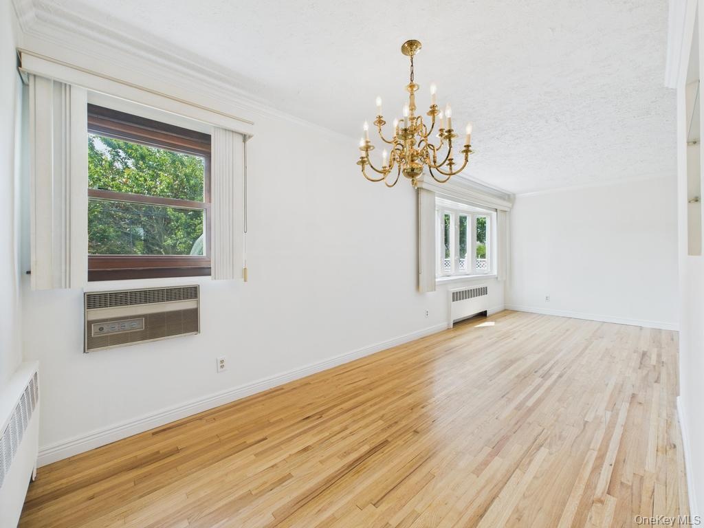 - Empty room featuring ornamental molding, light wood finished floors, a chandelier, and radiator heating unit