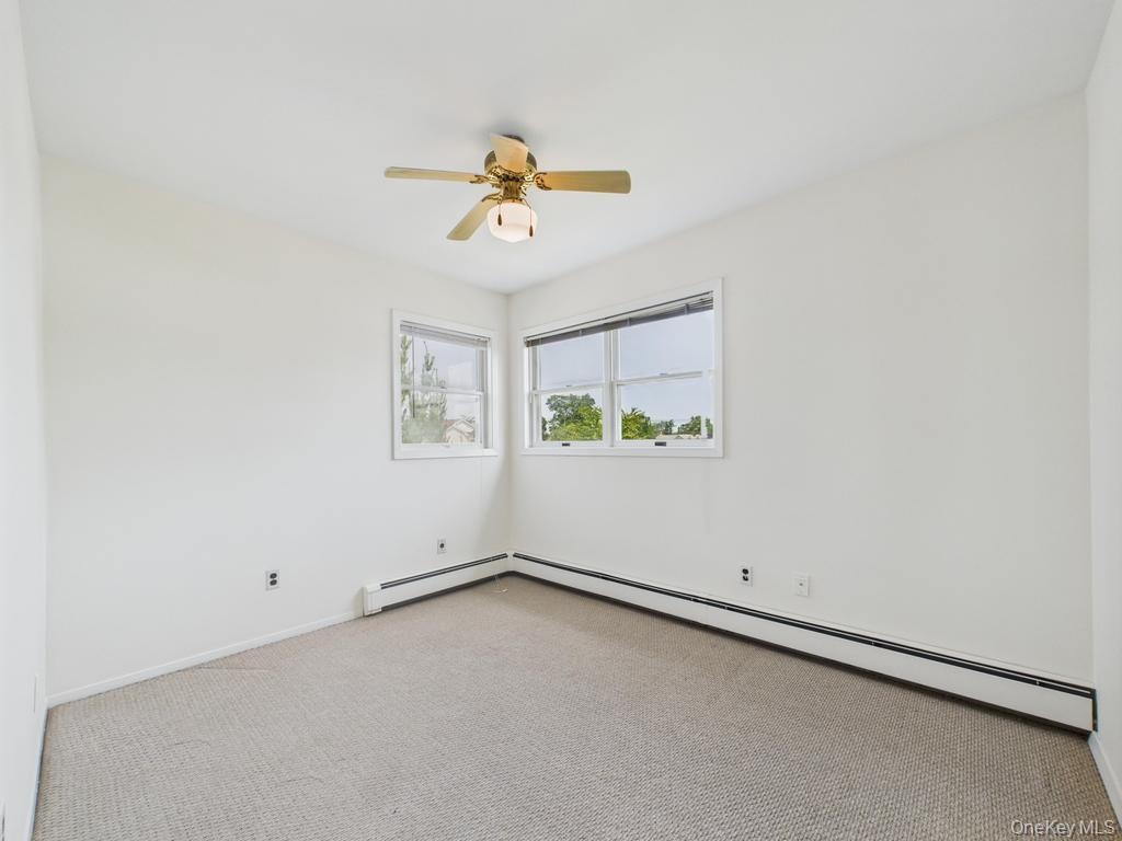 - Carpeted spare room featuring a baseboard heating unit and ceiling fan