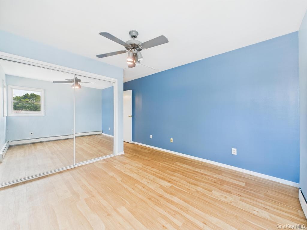 - Unfurnished bedroom with light wood-type flooring, a closet, a ceiling fan, and a baseboard radiator