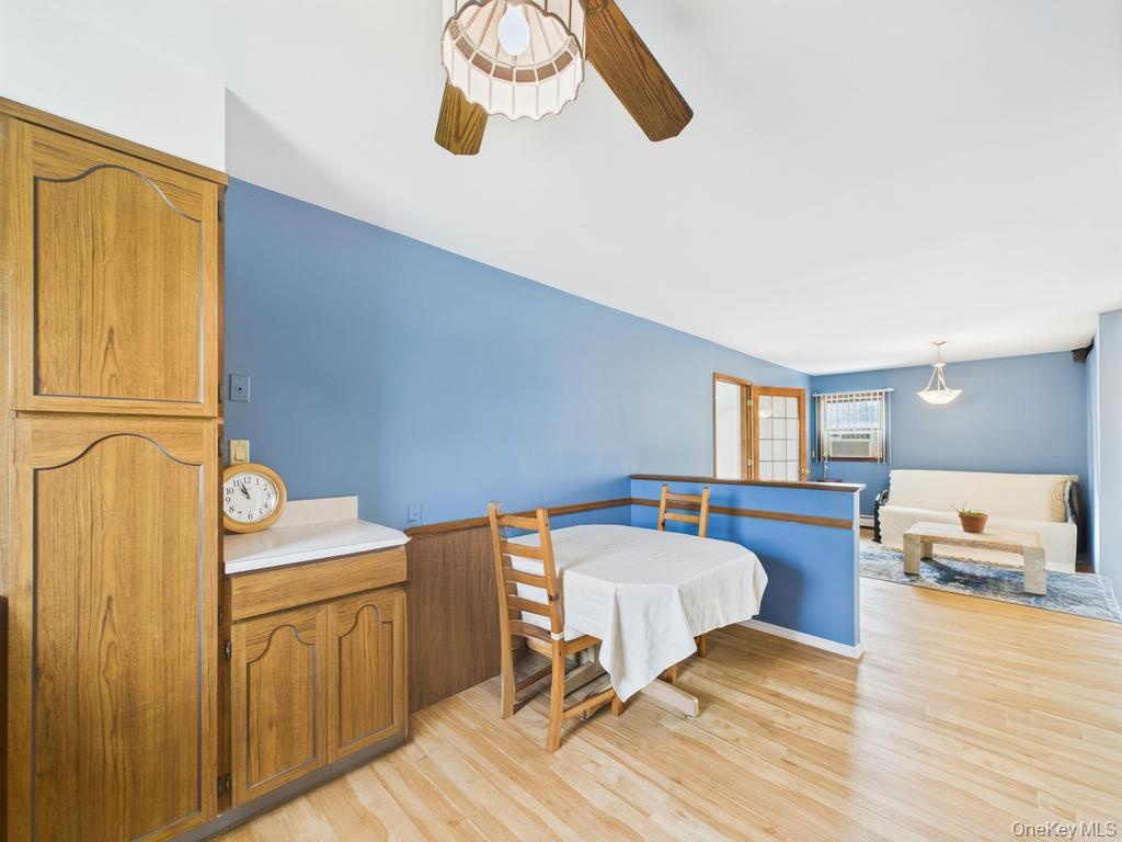 - Dining area featuring light wood-style flooring and a ceiling fan