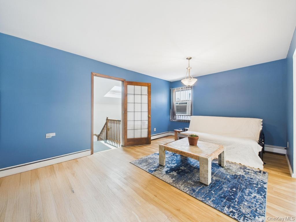 - Living area with light wood-style floors, a baseboard radiator, and ceiling fan