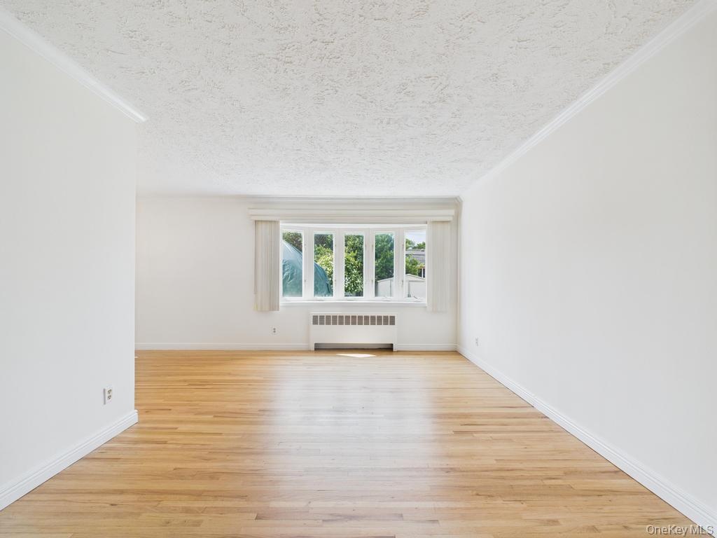 - Spare room featuring light wood finished floors, radiator, crown molding, and a textured ceiling