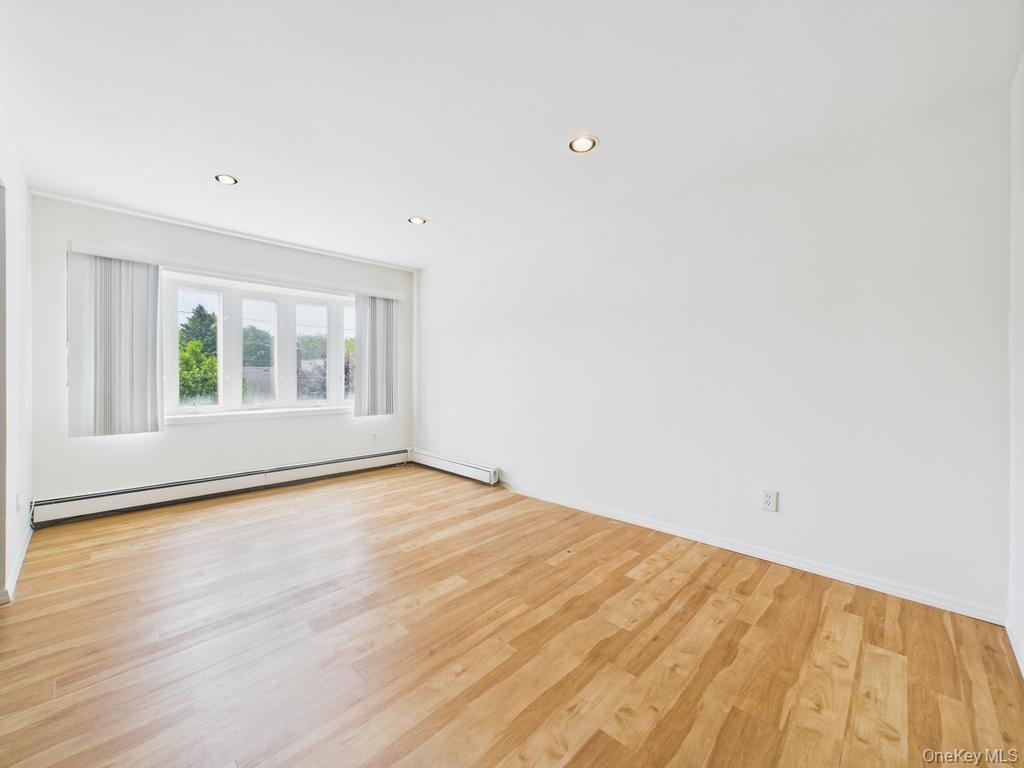 - Unfurnished room with light wood-style flooring, recessed lighting, and a baseboard radiator