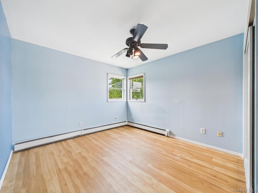 - Unfurnished room featuring light wood finished floors, baseboard heating, and ceiling fan