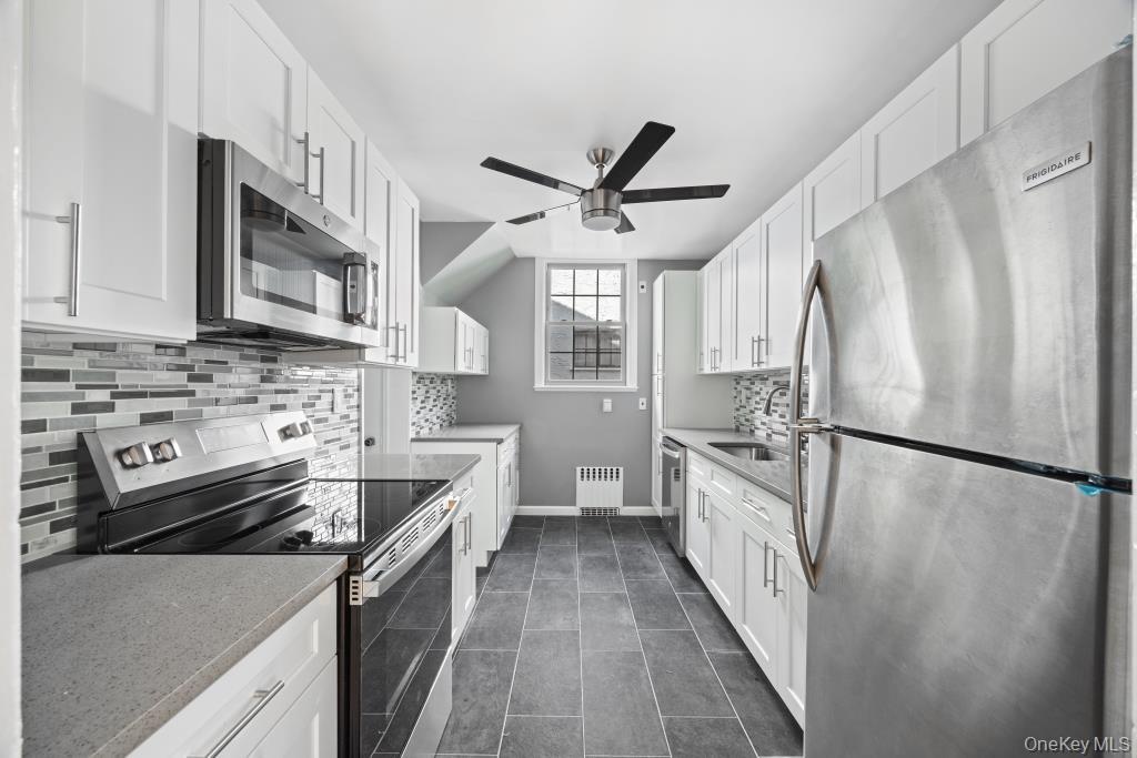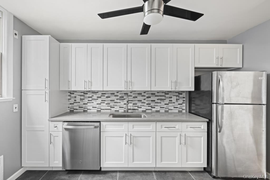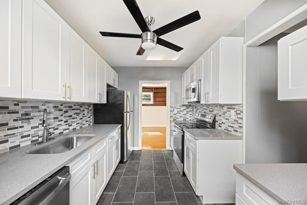 - Kitchen featuring appliances with stainless steel finishes, decorative backsplash, white cabinets, dark tile patterned floors, and a ceiling fan