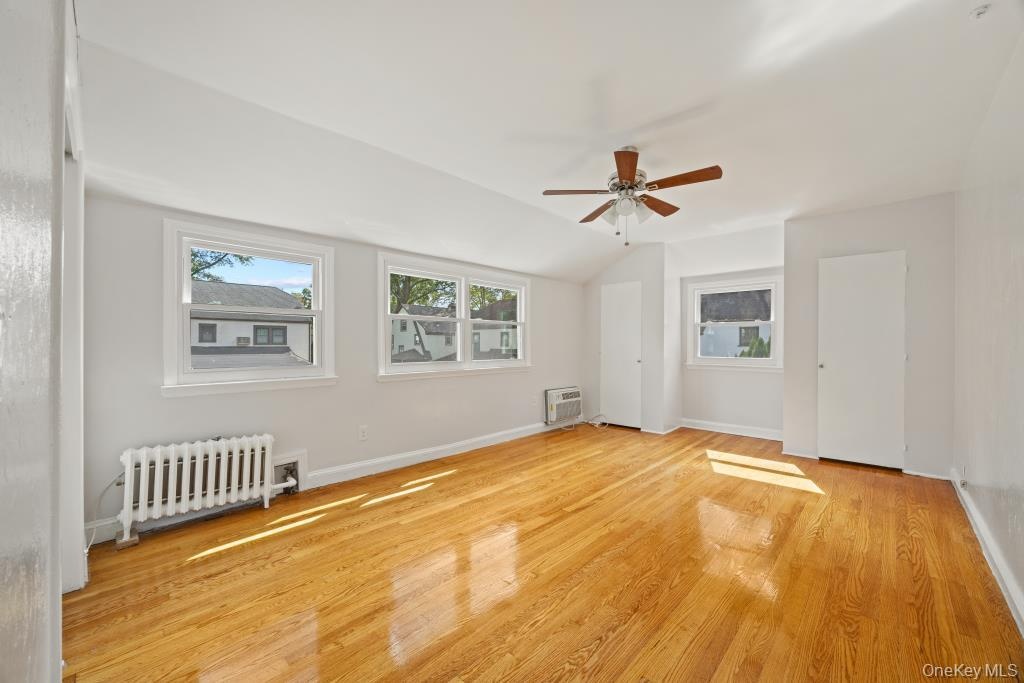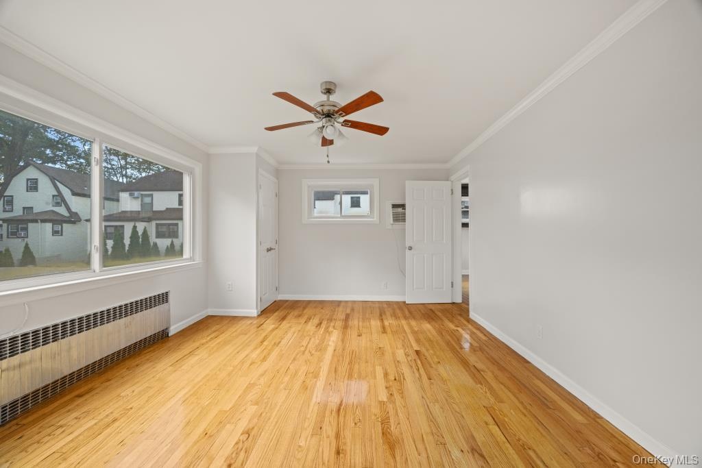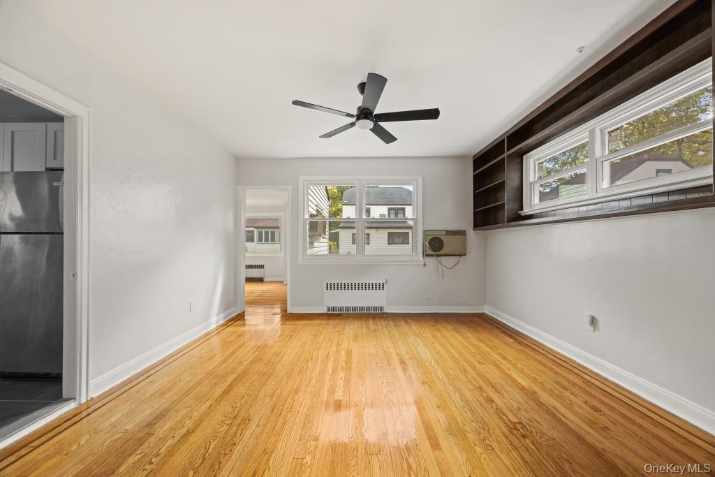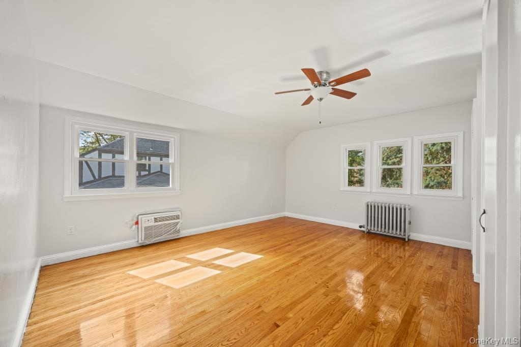 - Spare room with light wood-type flooring, radiator, a ceiling fan, and a wall unit AC
