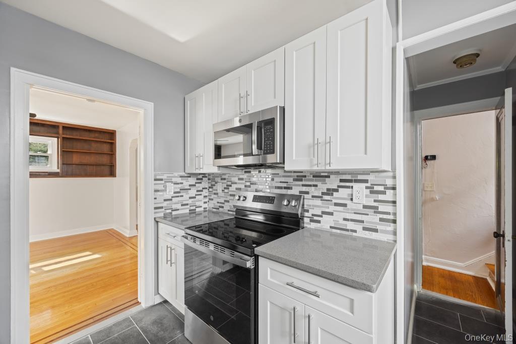 - Kitchen with stainless steel appliances, white cabinets, dark tile patterned flooring, backsplash, and light stone countertops