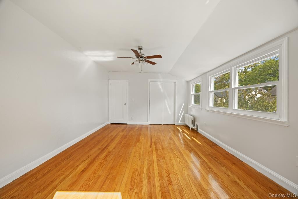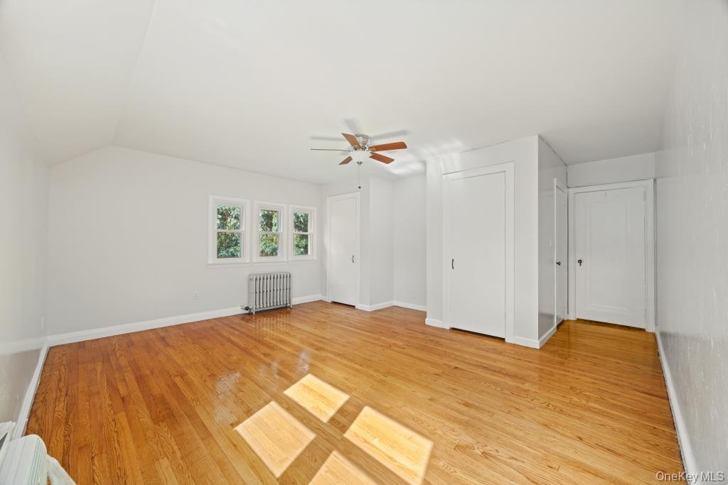 - Unfurnished room featuring vaulted ceiling, light wood-style flooring, radiator, and a ceiling fan