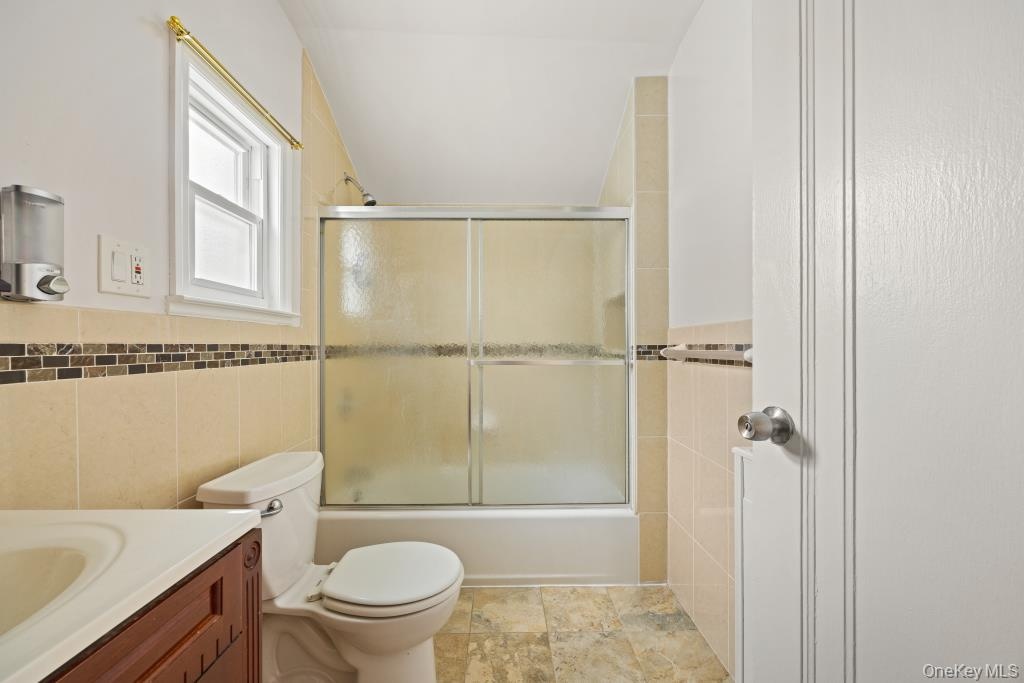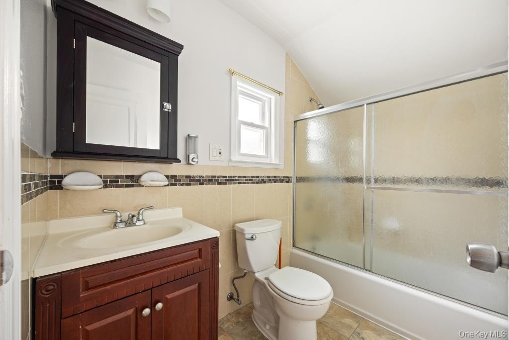 - Bathroom featuring tile walls, shower / bath combination with glass door, and vanity