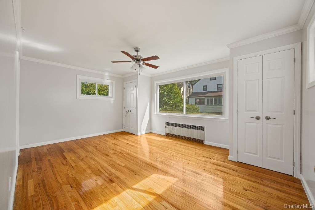- Spare room with radiator heating unit, crown molding, light wood finished floors, and ceiling fan
