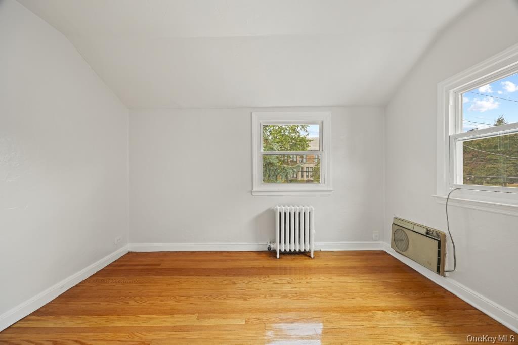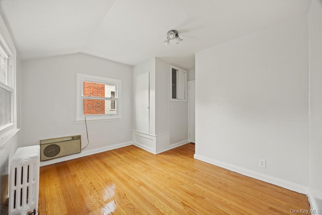 - Additional living space with light wood-type flooring, radiator heating unit, healthy amount of natural light, vaulted ceiling, and a wall unit AC