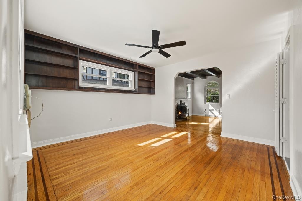- Empty room with light wood finished floors, built in shelves, arched walkways, and ceiling fan