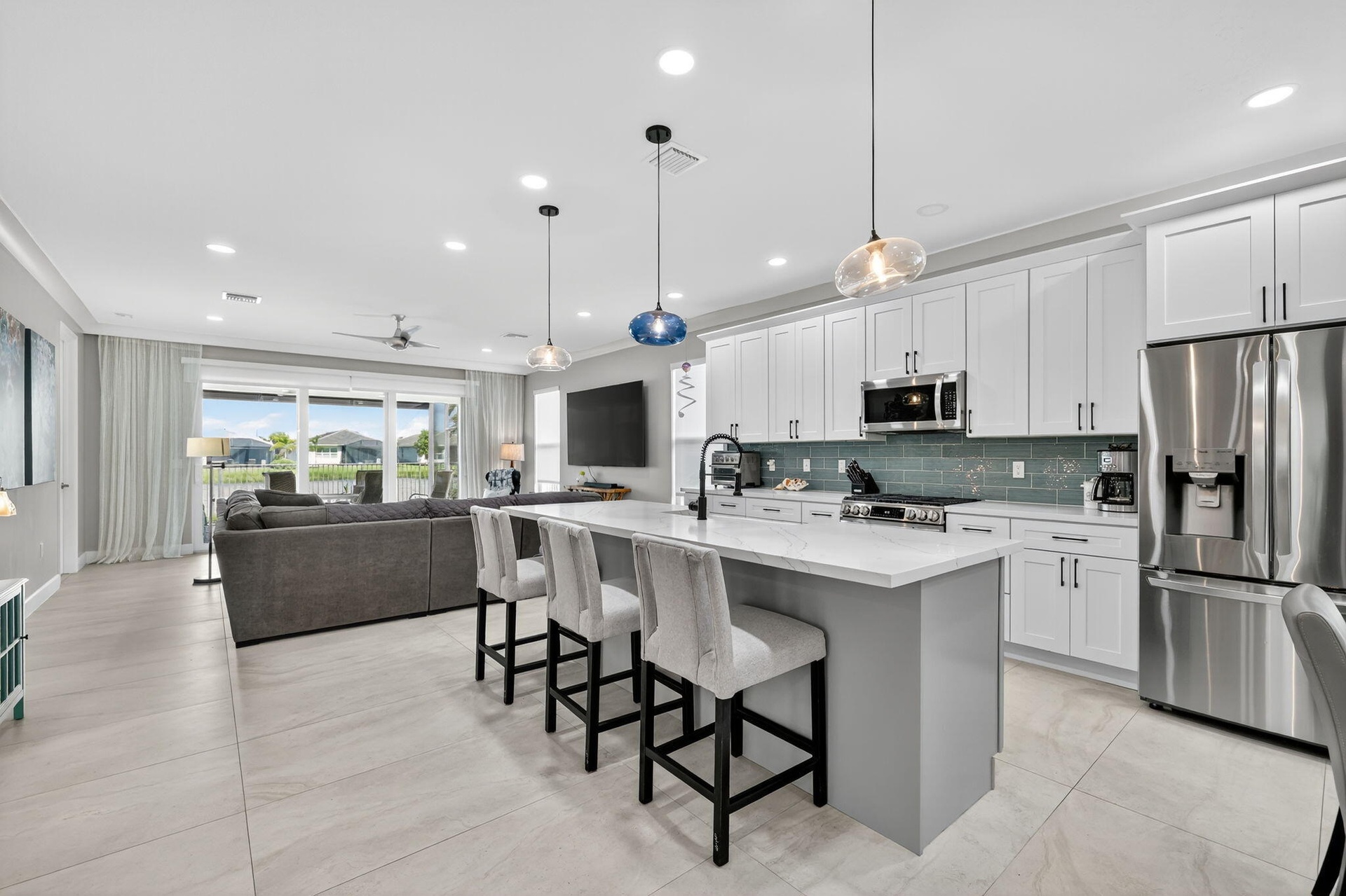 DescriptionWelcome to GL's premier 55+ community of Valencia Grove at Riverland--where sophistication meets thoughtful design. Originally a Marsala model, this exceptional home has been custom reimagined and reconfigured by an architect to create a truly one-of-a-kind residence offering luxury, comfort, and functionality throughout its 2,127 square feet under air. From the moment you arrive, the widened driveway, sealed pavers, and refreshed landscaping make a striking first impression. Inside, every detail has been meticulously curated, featuring 24'' x 36'' porcelain tile flooring, crown molding, designer lighting, premium paint, and solar shades throughout. The chef's kitchen is a showpiece with custom cabinetry, a full pantry, pull-out shelving, a farmhouse-style island sink, high-end backsplash,