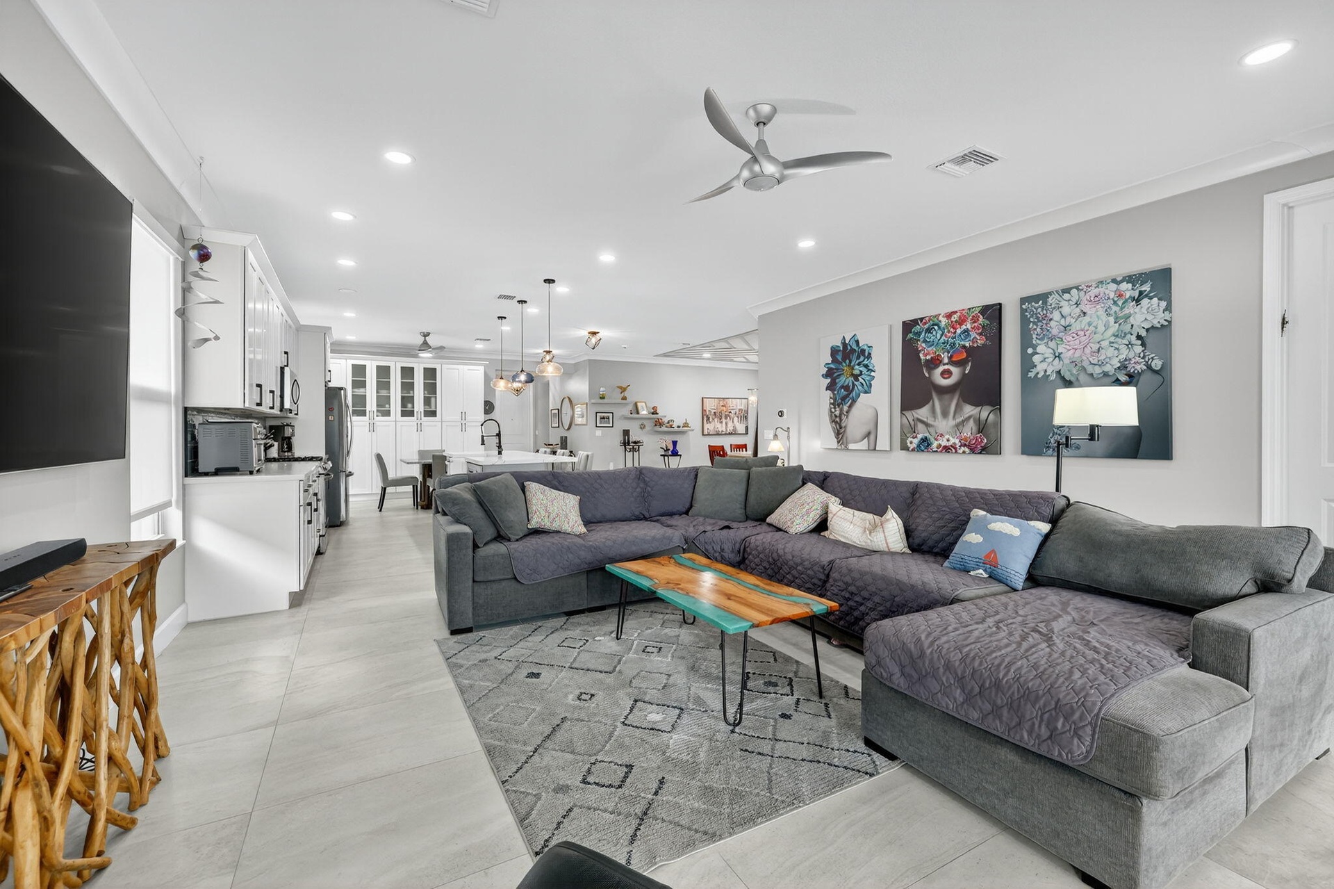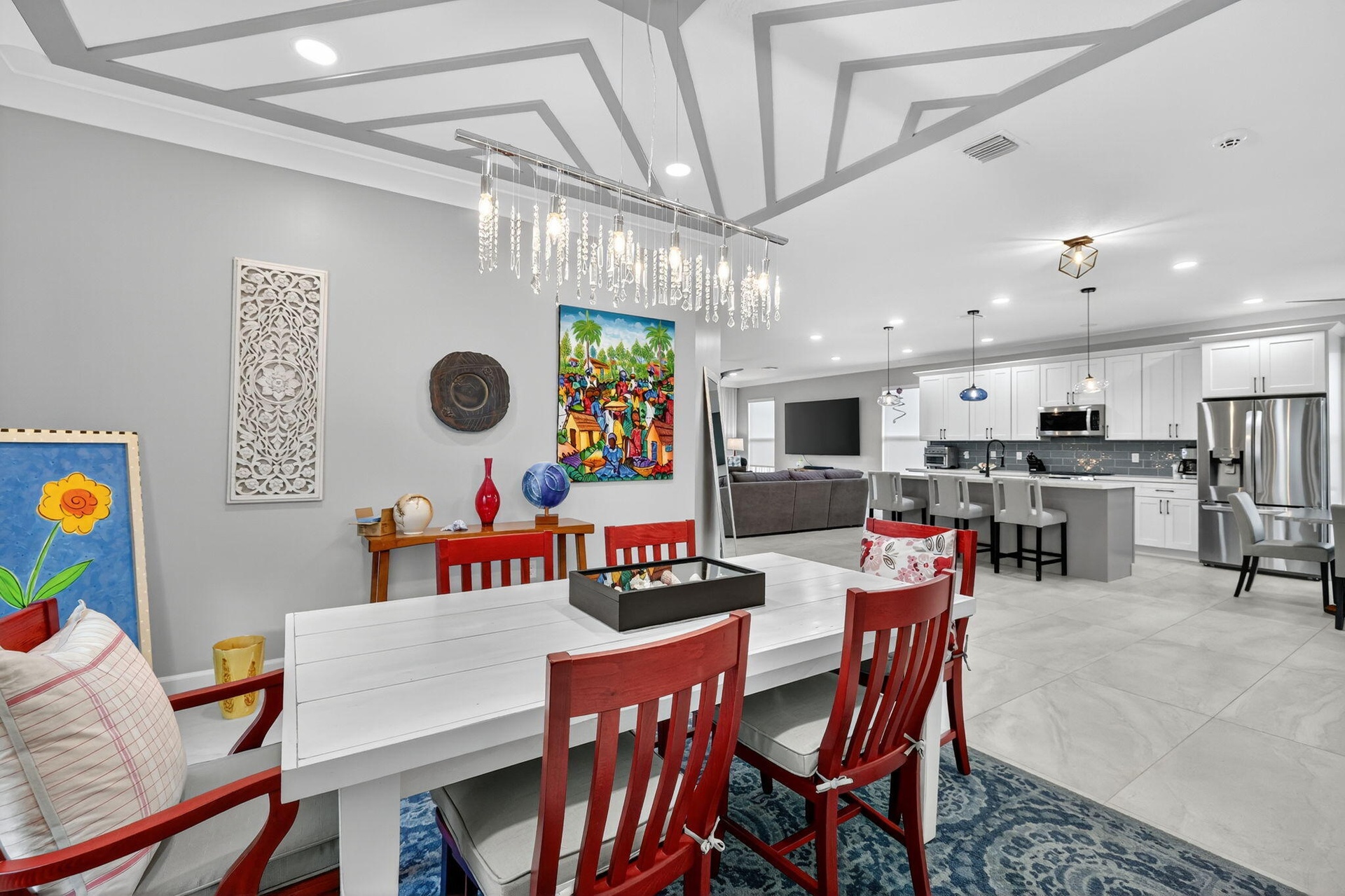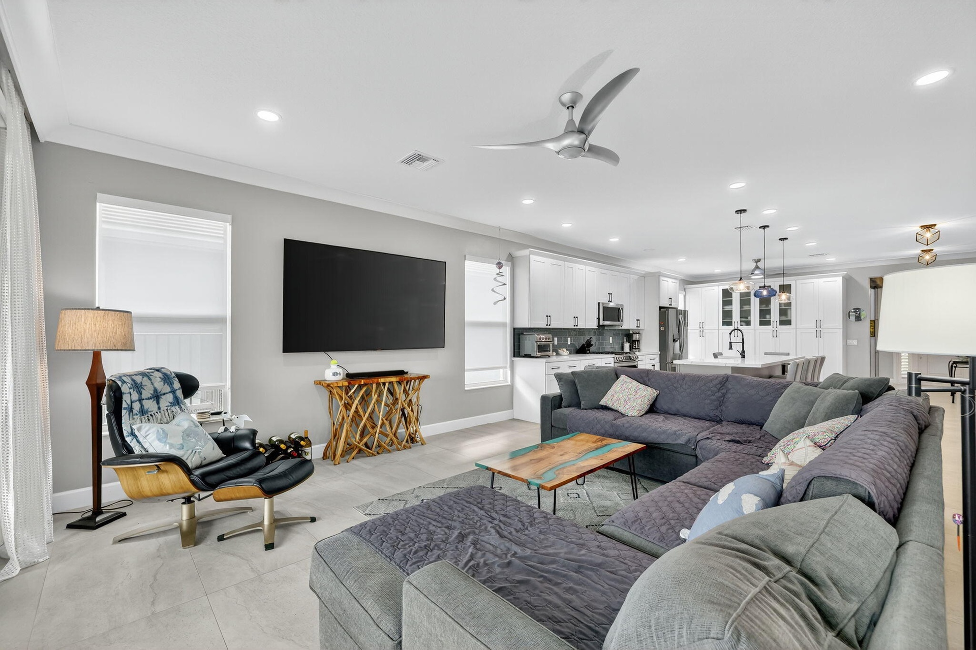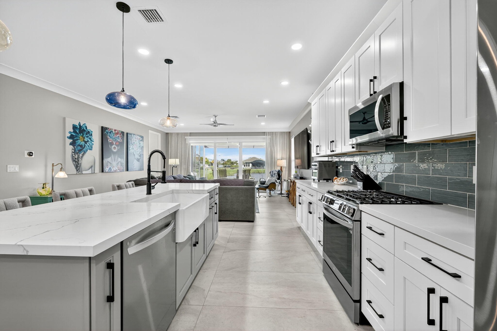 Welcome to GL's premier 55+ community of Valencia Grove at Riverland--where sophistication meets thoughtful design. Originally a Marsala model, this exceptional home has been custom reimagined and reconfigured by an architect to create a truly one-of-a-kind residence offering luxury, comfort, and functionality throughout its 2,127 square feet under air. From the moment you arrive, the widened driveway, sealed pavers, and refreshed landscaping make a striking first impression. Inside, every detail has been meticulously curated, featuring 24'' x 36'' porcelain tile flooring, crown molding, designer lighting, premium paint, and solar shades throughout. The chef's kitchen is a showpiece with custom cabinetry, a full pantry, pull-out shelving, a farmhouse-style island sink, high-end backsplash,