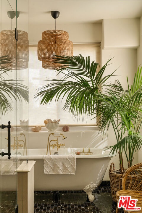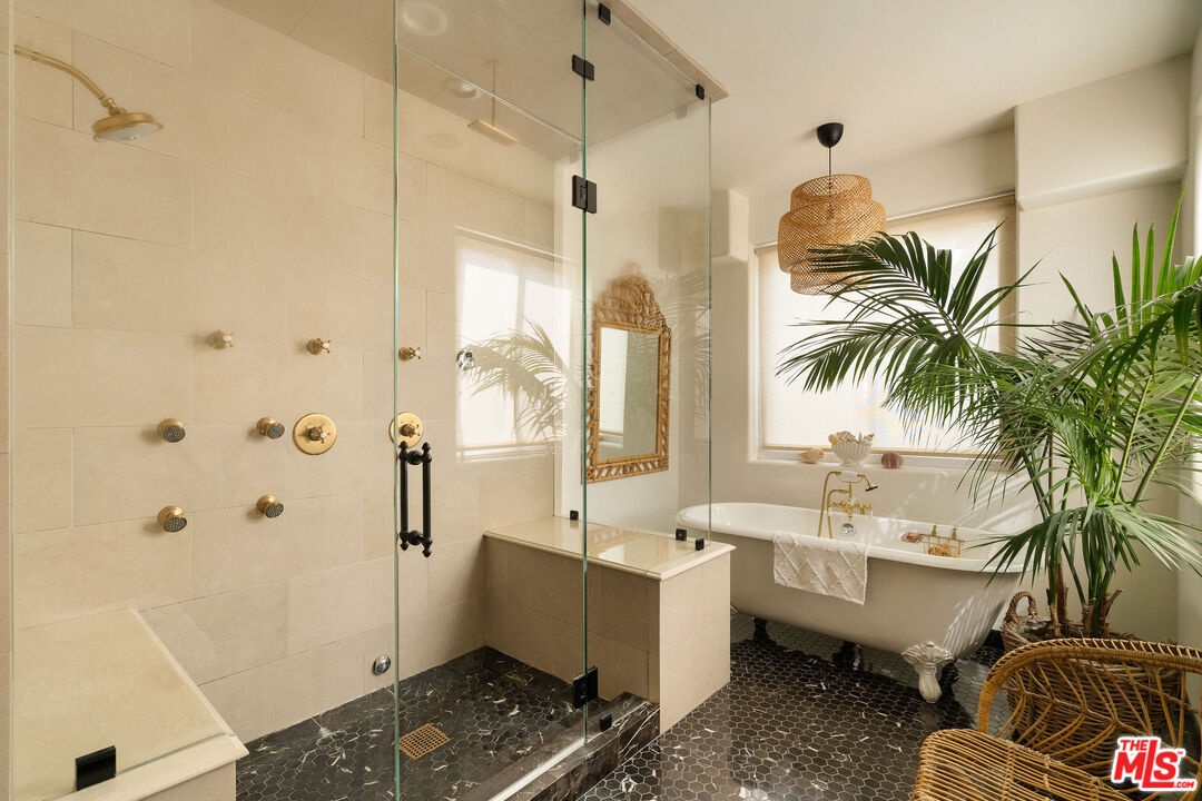 Beautifully renovated Beachwood Canyon contemporary masterpiece! Perched above the Hollywood Reservoir, this house is an art lover's dream come true, drenched in natural light with soaring ceilings, hardwood floors, gallery-style walls, and designer light fixtures throughout. The main floor is where the entertaining magic happens, with a huge living room that opens to a wrap-around porch, built-in bar, dining room that opens to the backyard with patio and heated pool, and a gorgeous chef's kitchen with top-of-the line appliances, marble countertops, black Zelig tiled backsplash, Farrow and Ball painted cabinets, and a lovely built-in seating area. The main floor also offers a powder room and two en-suite bedrooms. Upstairs, a practical and stylish library/office leads to the jaw-dropping primary suite, which features dual closets, an incredible bathroom with dual sinks, soaking tub, and steam shower, and a second wrap-around porch offering sweeping views of the hills and Downtown LA skyline. The outdoor space not only includes the pool and multiple patios, there is also a Provence-inspired garden with charming pathways dotted with citrus trees and herbs. So much to love inside and out and a great location close to Beachwood Village and scenic hiking trails, this home offers the dream Beachwood Canyon lifestyle.