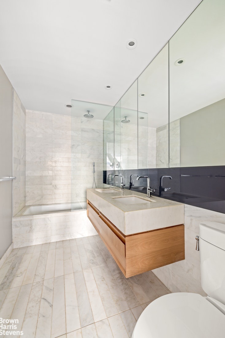 An extra wide gallery, perfect for your larger-scale art pieces, leads to the bedrooms. Both bedrooms offer serene privacy and are also showered in brilliant southern light. The king-sized primary bedroom boasts a large walk-in closet and a spacious en-suite bathroom. The second bedroom can also fit a king-size bed and has ample closet space. The bathrooms are crafted with contemporary elegance boasting marble countertops, walnut vanities, and luxurious soaking tubs. Complete with oak hardwood floors, generous closet space, an in-unit washer/dryer and central air, this gorgeous home is ready for its next chapter!