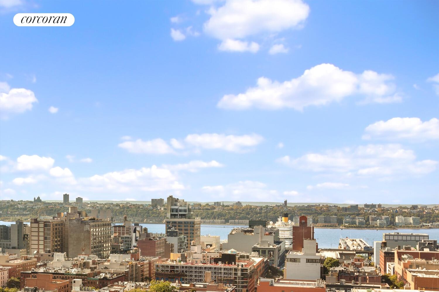 Upon entry, you're welcomed into a bright, open living and dining area framed by oversized windows showcasing sweeping southern and western views. Sunlight fills the space throughout the day, and evenings bring unforgettable sunsets over the Hudson River.