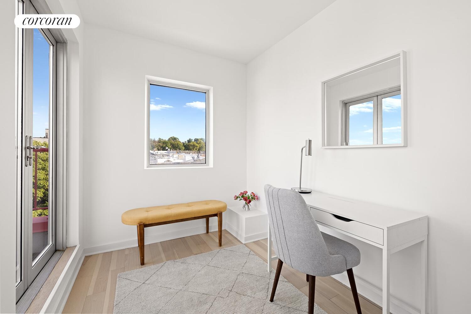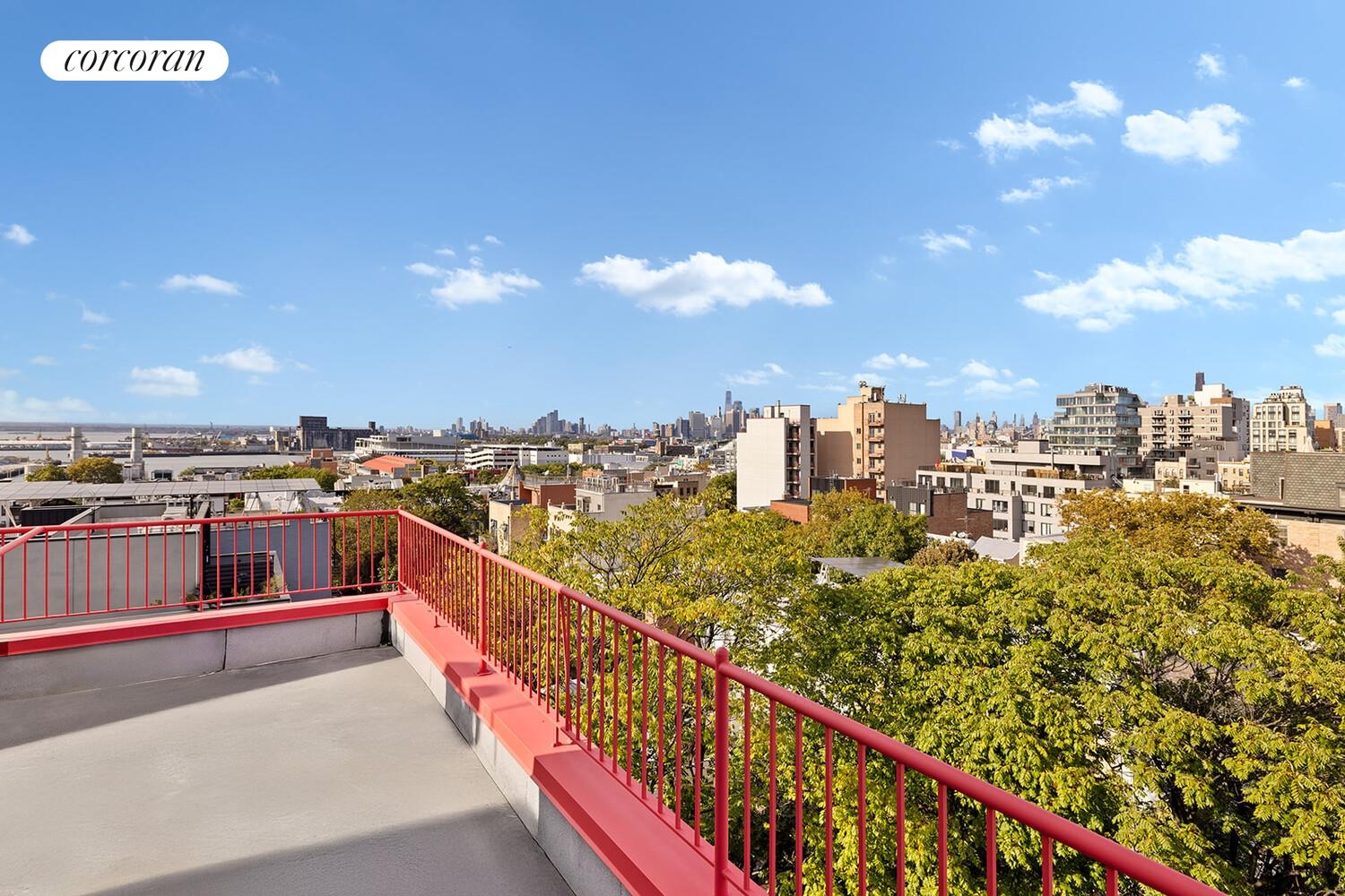 The highlight of this apartment-beyond its sunny, loft-like feel-is undoubtedly its exceptional private outdoor offerings. The generous balcony and private roof terrace, accessible directly from the apartment, provide an unparalleled vantage point for taking in the sparkling lights of the New York City skyline and waterfront each night. Perched high above the hustle and bustle of this vibrant neighborhood, this home feels like a serene oasis among the treetops-private and secluded, with no neighbors above or on either side. Both outdoor spaces invite quiet moments of retreat and offer breathtaking, ever-changing views.