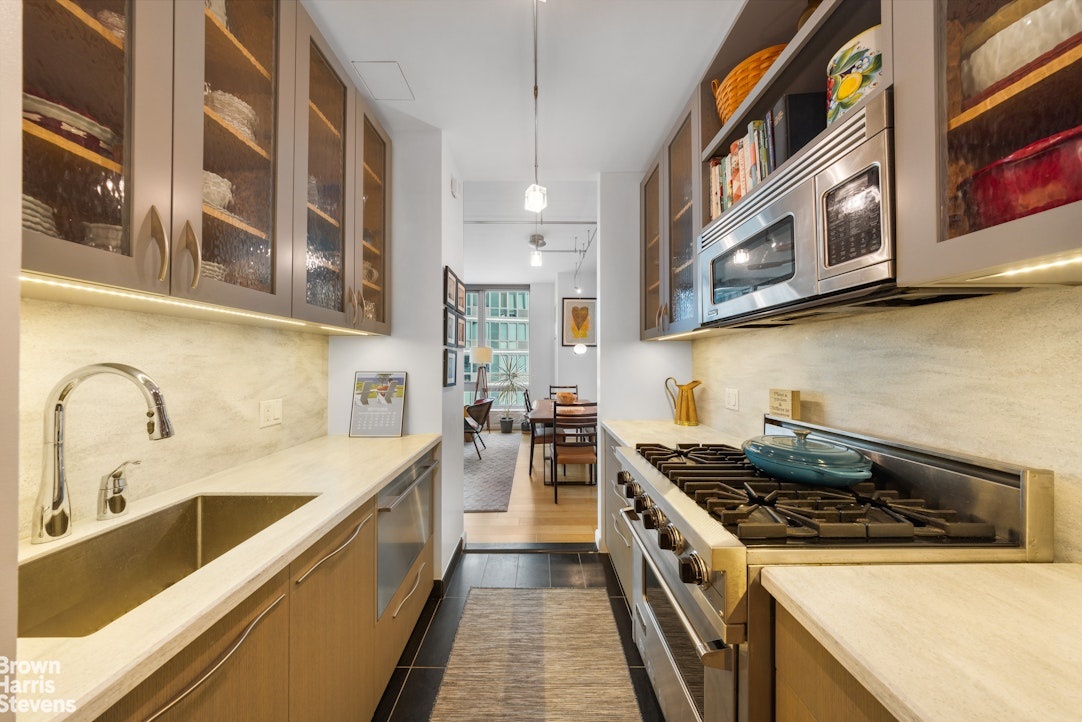 -Custom Kitchen: Rift white oak and lacquer cabinets with art glass doors, built-in spice rack and wine storage, Corian countertops/backsplash, under-cabinet lighting, deep Kraus sink with Kohler fixtures, built-in water filter and soap dispenser, and added pantry space.