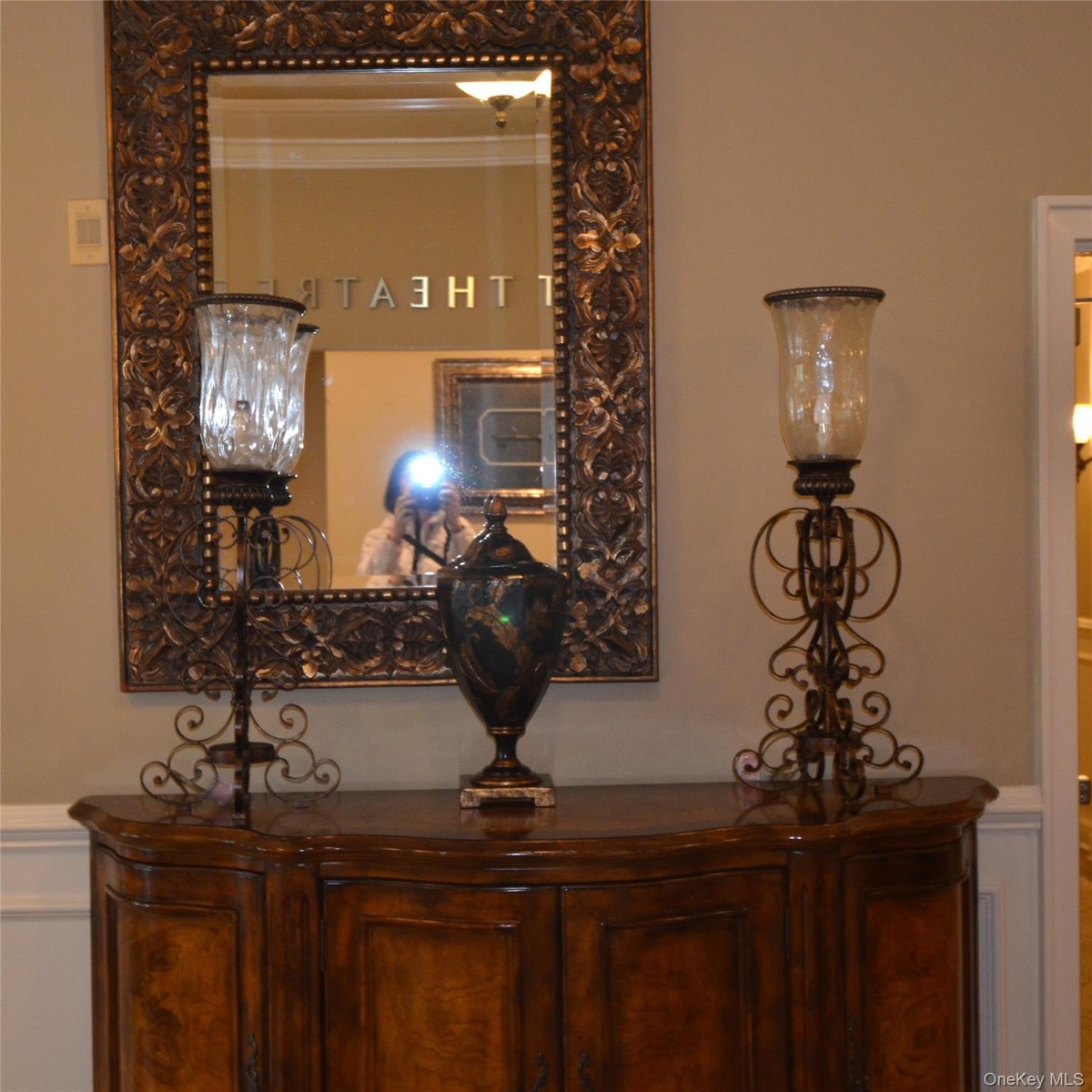 - Rec room with ornamental molding, a healthy amount of sunlight, a fireplace, and wainscoting