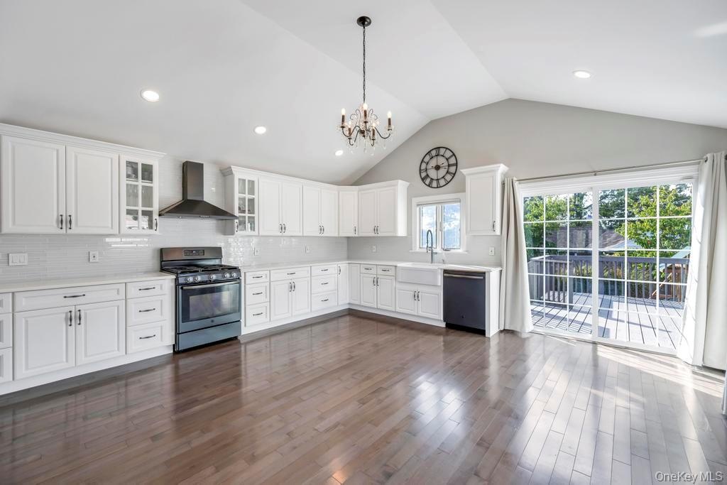 The massive open-concept living space features vaulted ceilings and a newly renovated chef’s kitchen with stunning quartz countertops, gas stove and newer appliances — it’s the kind of kitchen that will make your friends jealous (and your dinner parties legendary!). Whether you’re entertaining in the spacious living/dining area or hosting a full-house gathering, there’s room for everyone here. Glass sliders open to a large deck and paved patio, surrounded by professional landscaping — perfect for BBQs, get-togethers, or simply unwinding under the stars.
