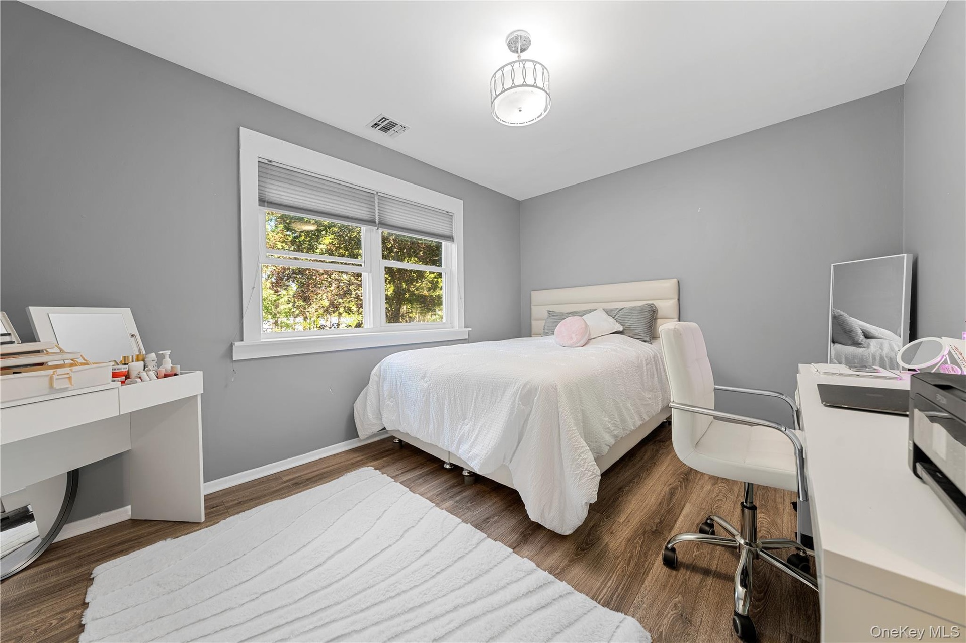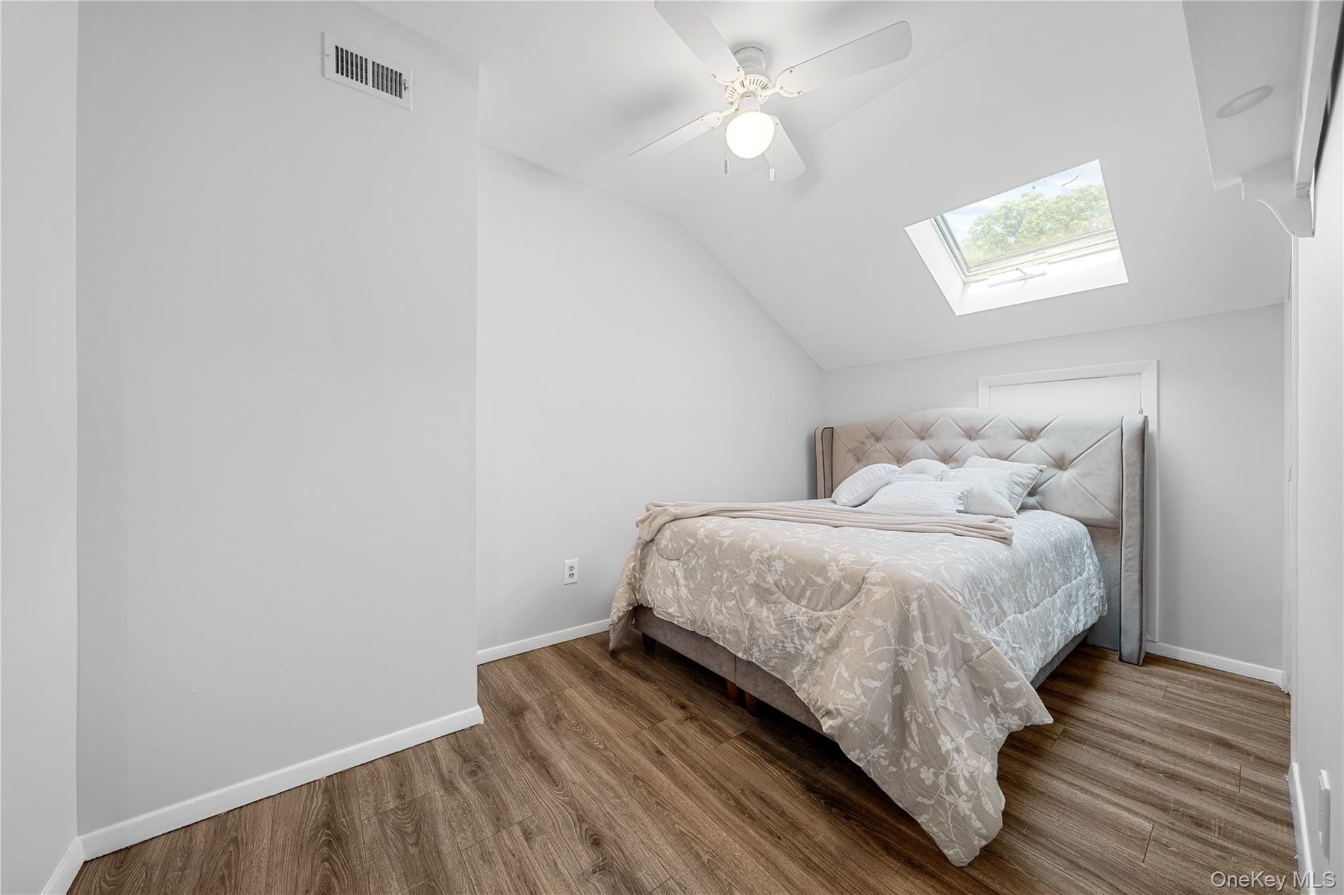 - Bedroom with a skylight, vaulted ceiling, wood finished floors, and a ceiling fan