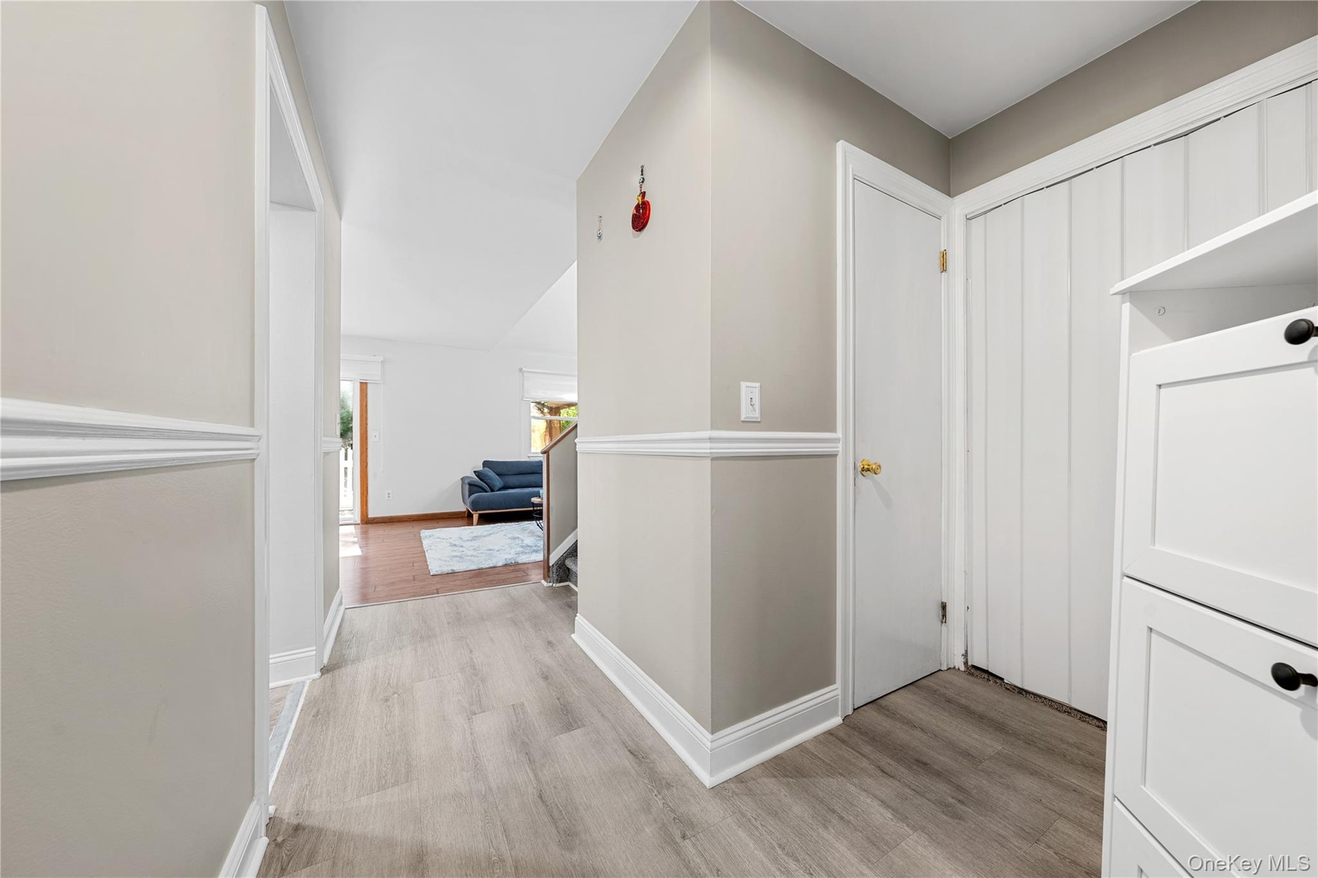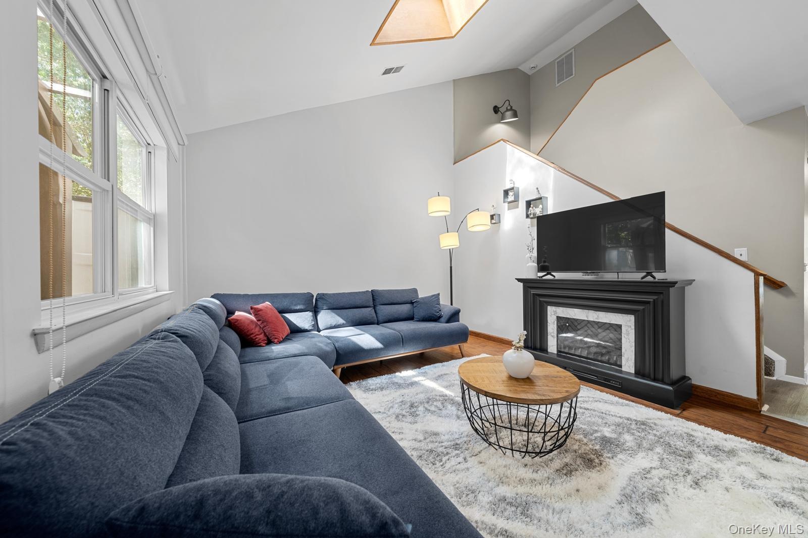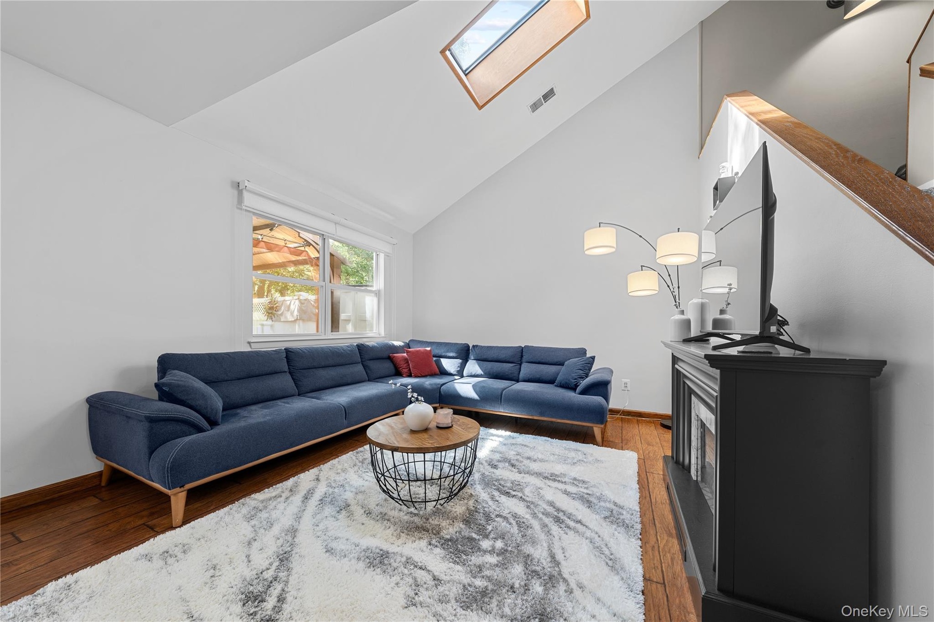 - Living room with high vaulted ceiling, wood finished floors, and a skylight