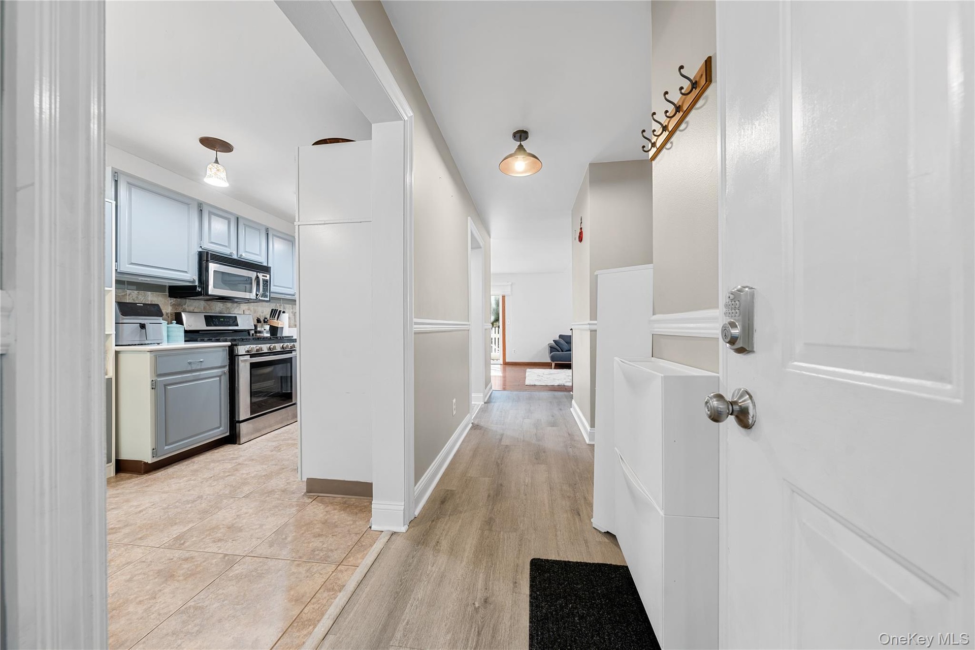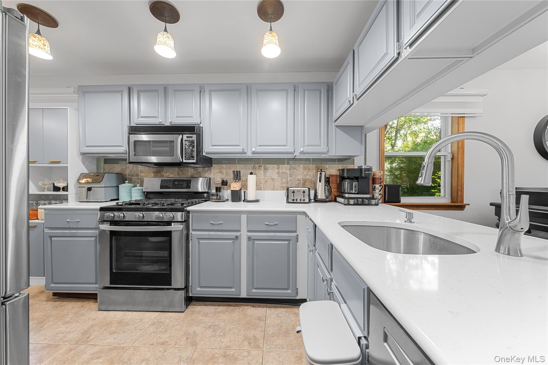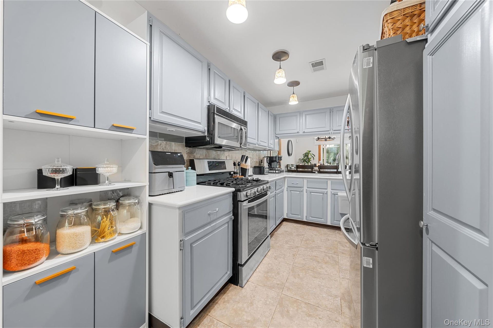 - Kitchen with stainless steel appliances, backsplash, gray cabinetry, light tile patterned floors, and light countertops
