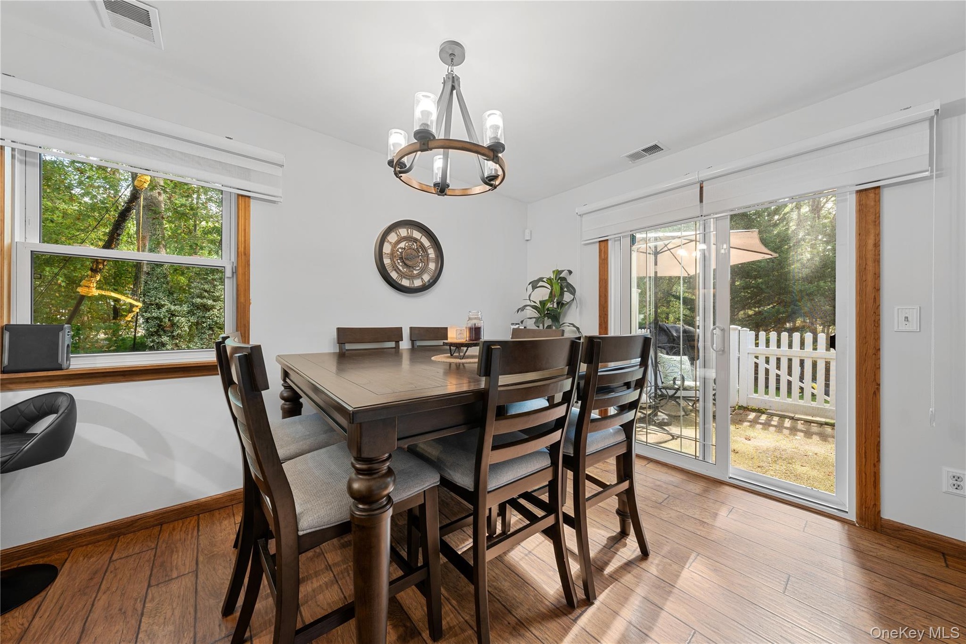 - Dining area featuring plenty of natural light, light wood-type flooring, and a chandelier