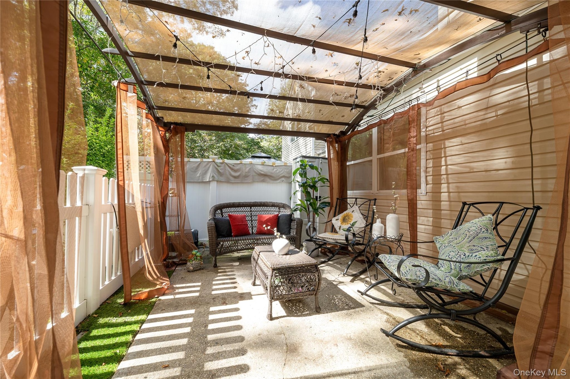 - Fenced backyard with an outdoor living space, a patio, and a pergola