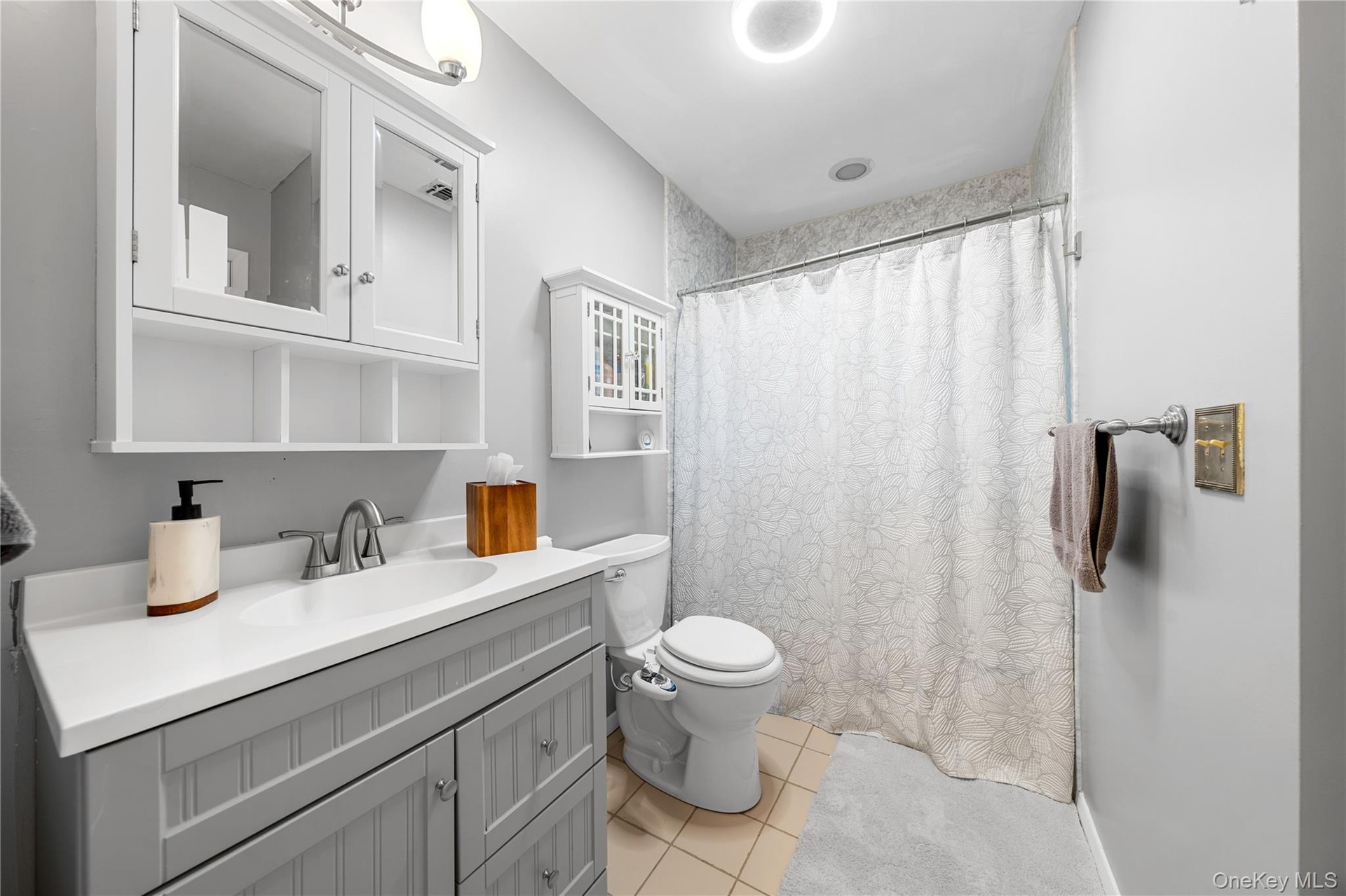- Full bath featuring light tile patterned flooring, vanity, and a shower with curtain