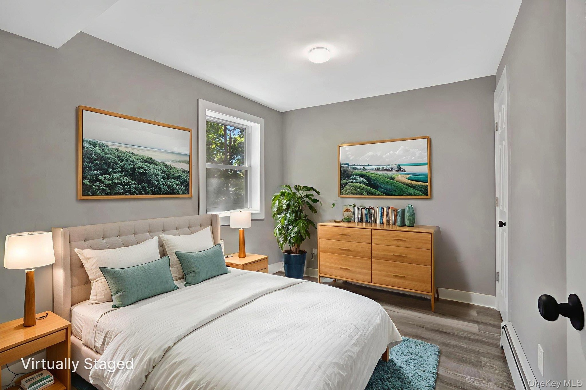 - Bedroom with a baseboard heating unit and light wood-type flooring