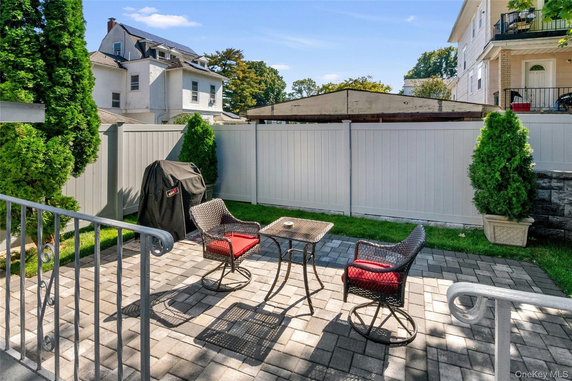 - Fenced backyard with a patio area and a grill